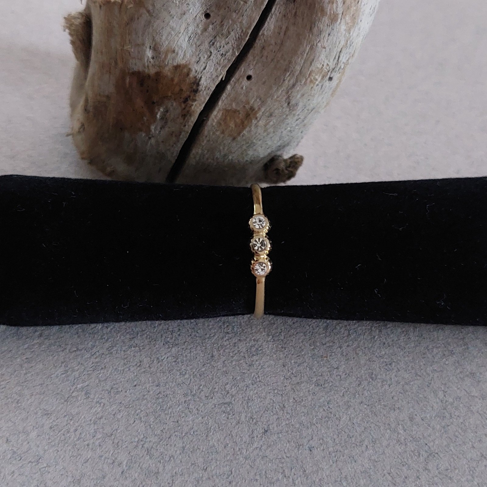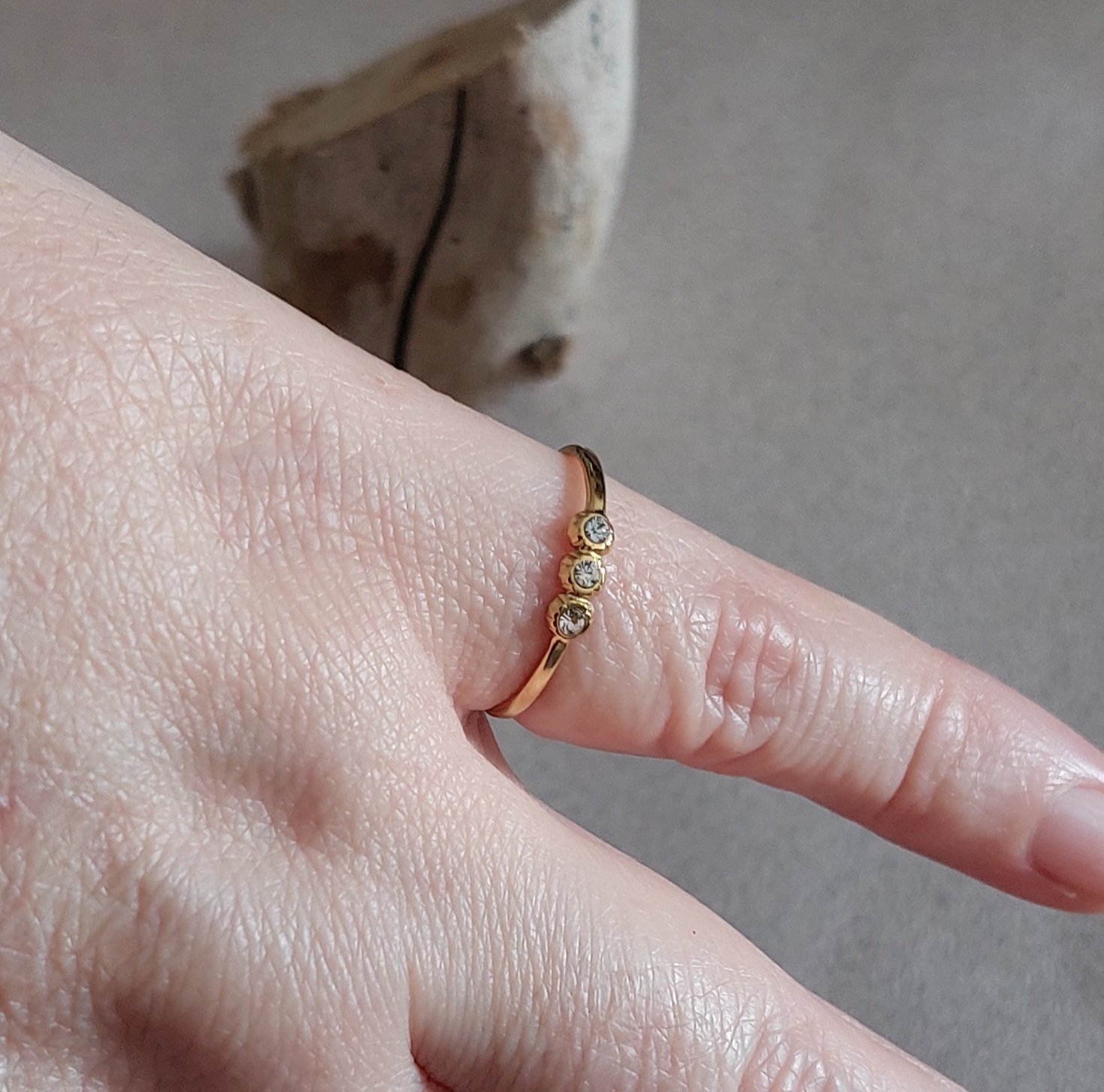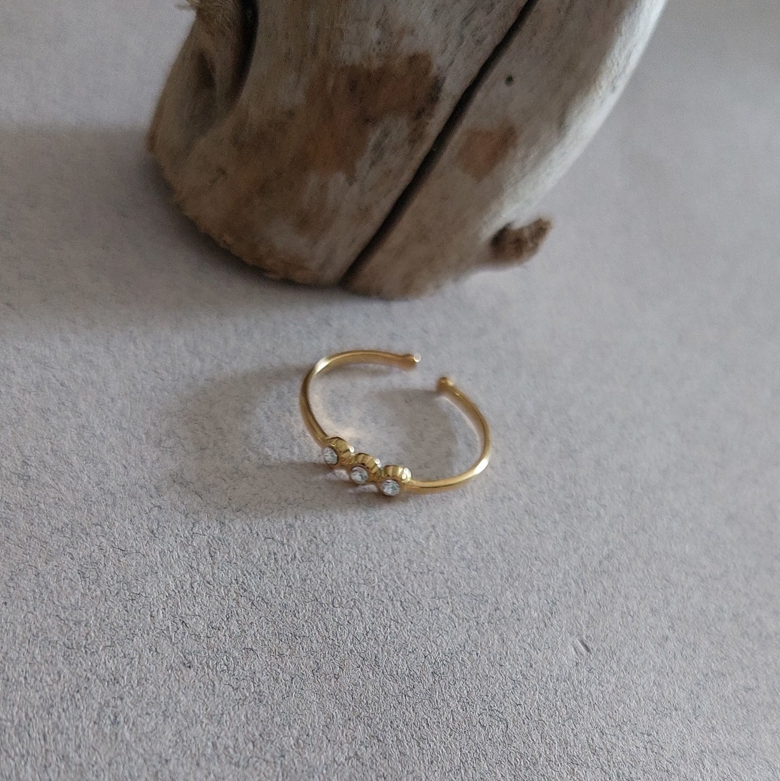 Bague fine en acier doré – Trio d’oxydes de zirconium couleur cristal