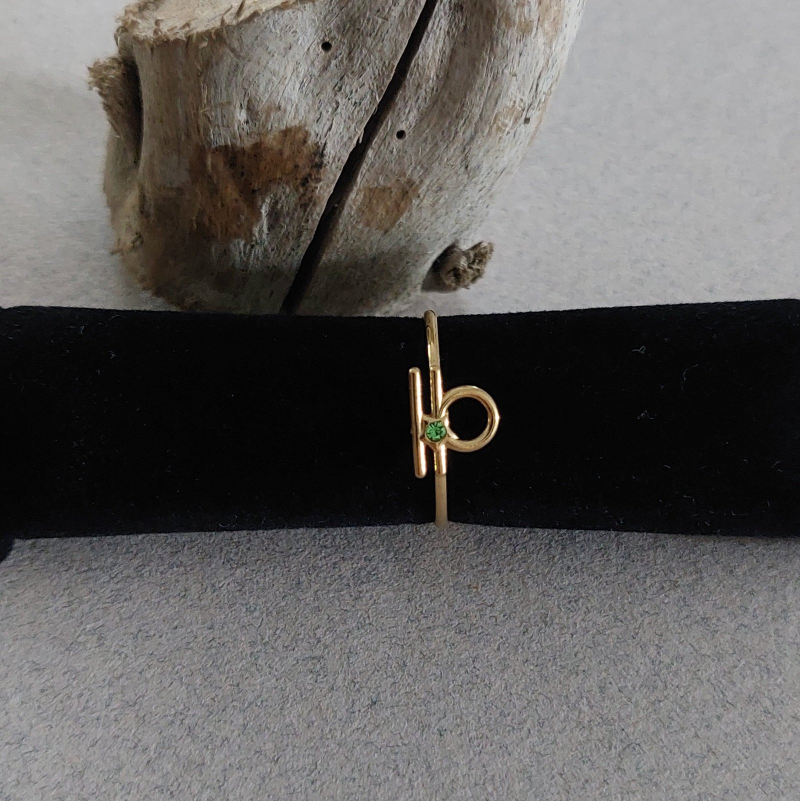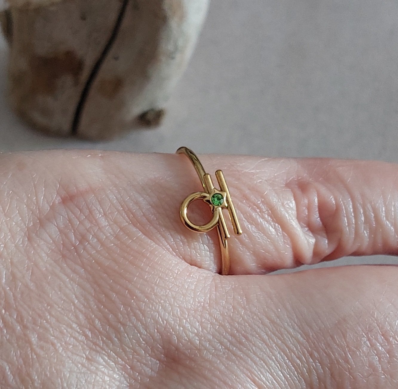 Une bague en acier 304L doré, ornée d’un oxyde de zirconium péridot, symbole d’harmonie et d’élégance, en lien avec le signe de la Balance.