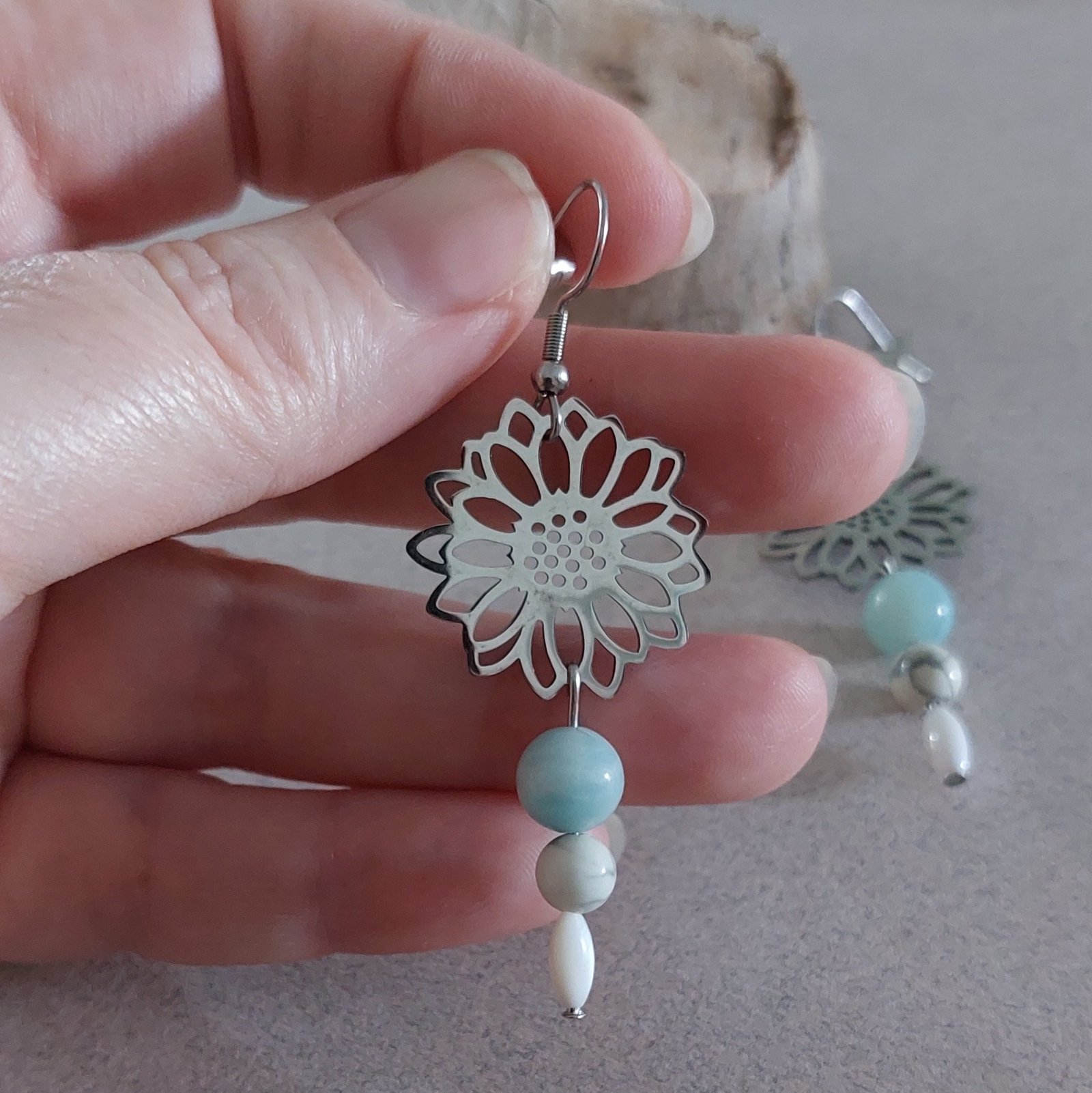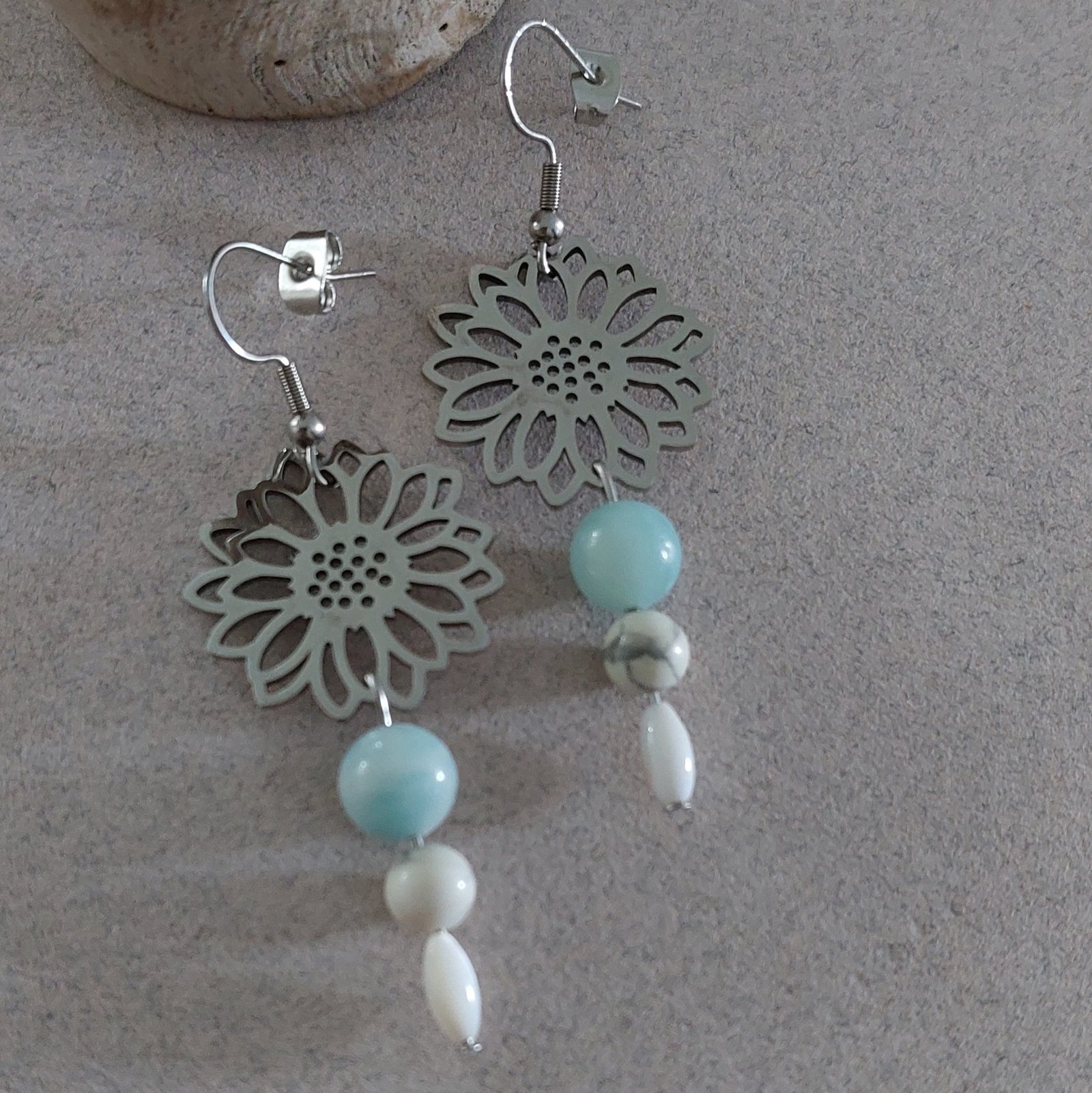 Fan de l’argenté, ces boucles en acier, amazonite, howlite et perle sont pour vous!