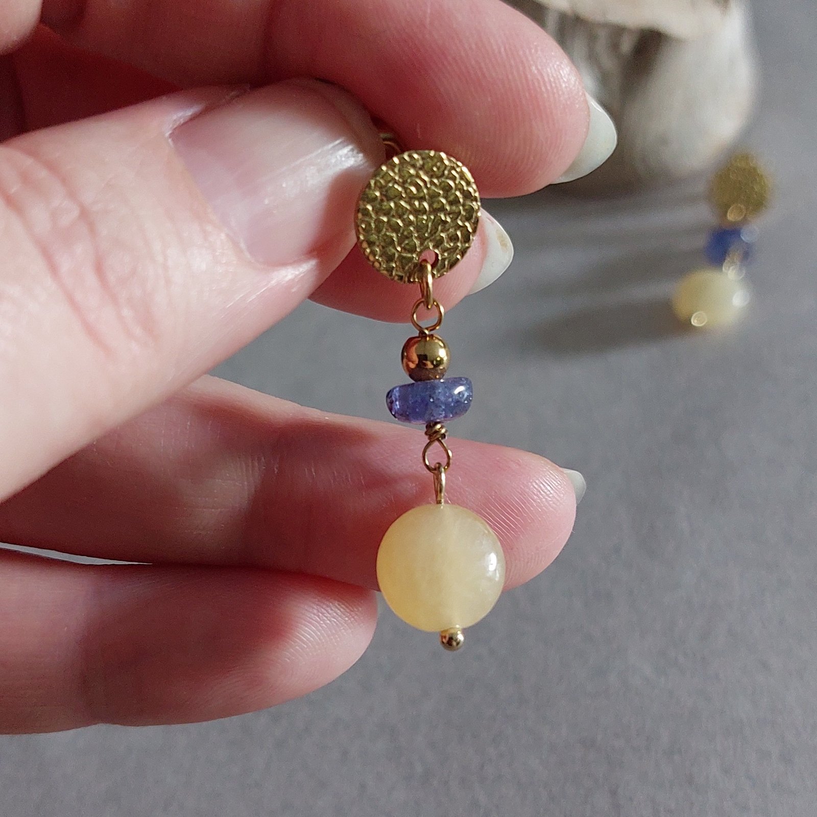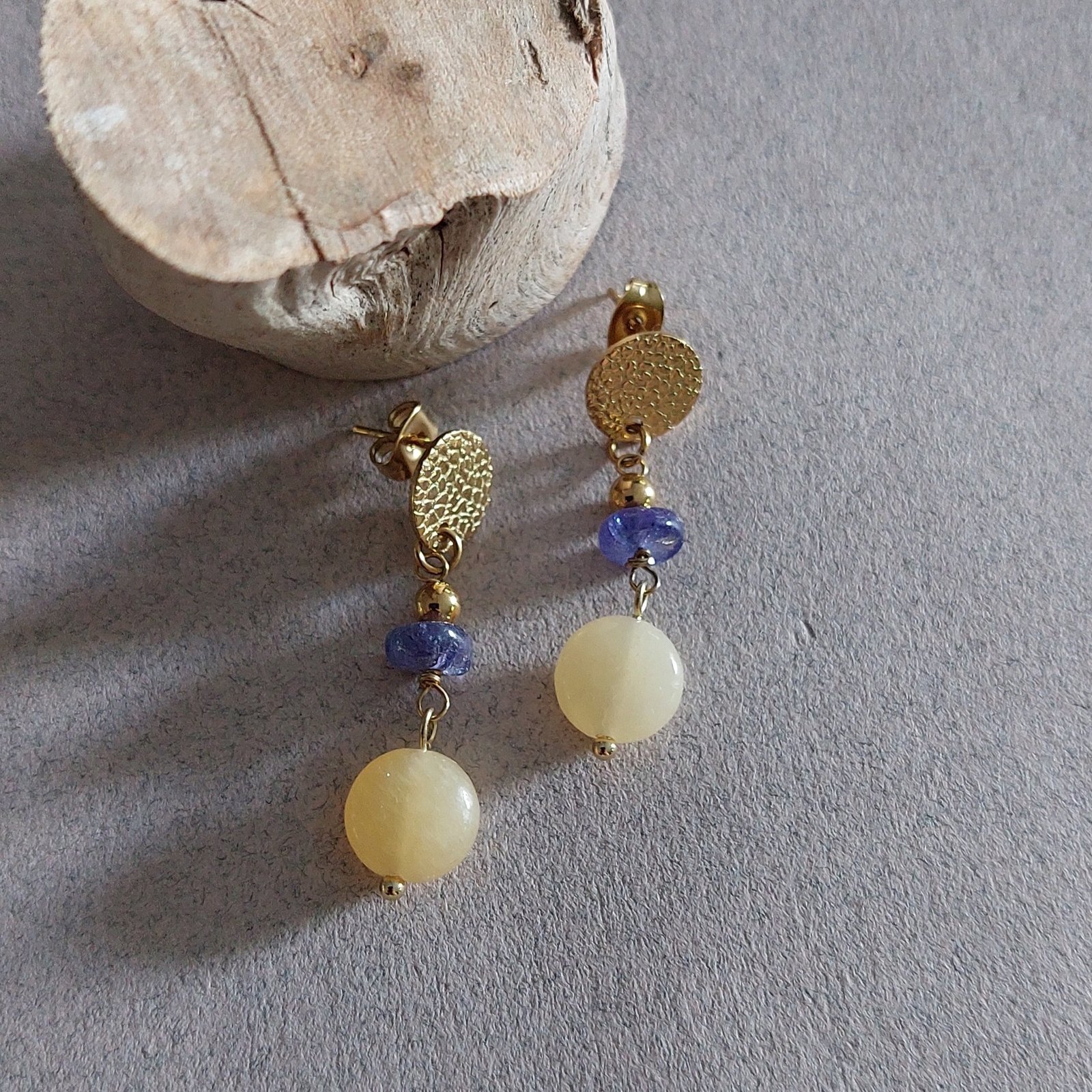 🤍 Boucles CALYA ▪︎ Acier doré 304 ▪︎ Tanzanite & Jade jaune