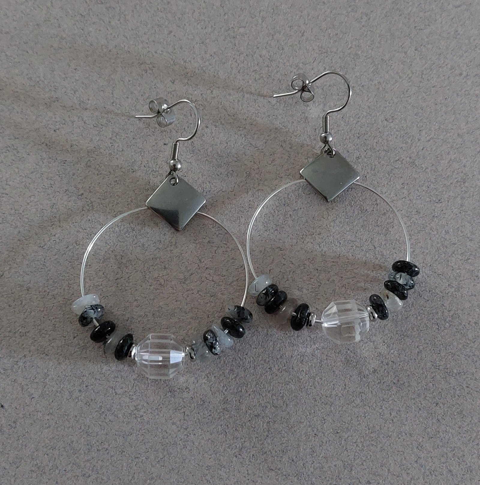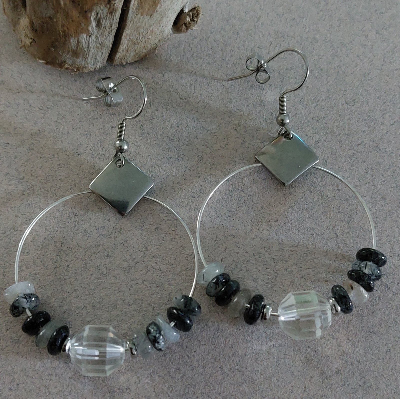 Ces belles créoles sont dans les tons gris, noir et transparent avec le cristal de roche et le quartz à inclusions de tourmaline.