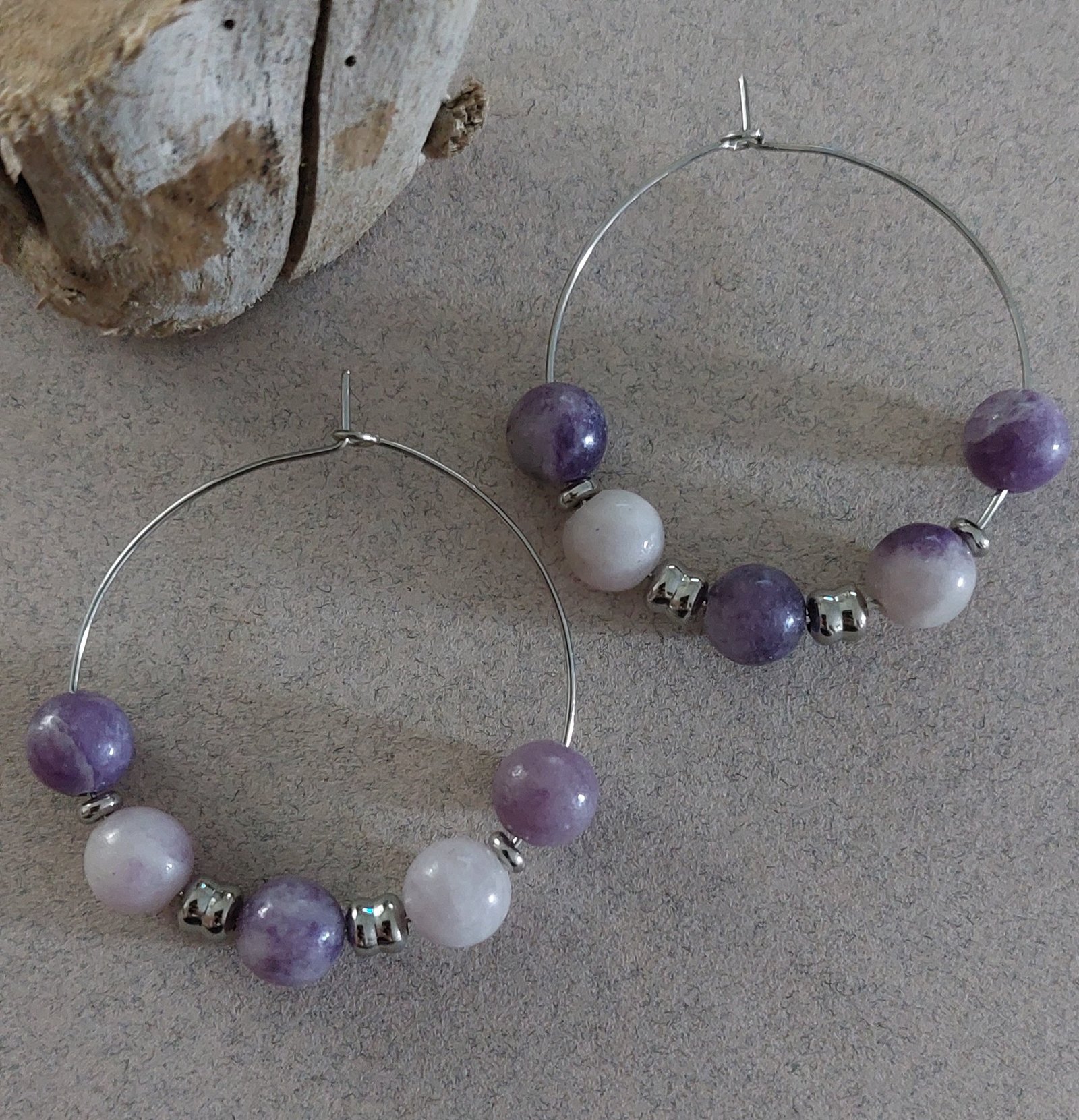 Vous aimez les pierres de belle dimension, ces créoles sont faites pour vous! Le lilas est mis ici à l’honneur avec la lépidolite.