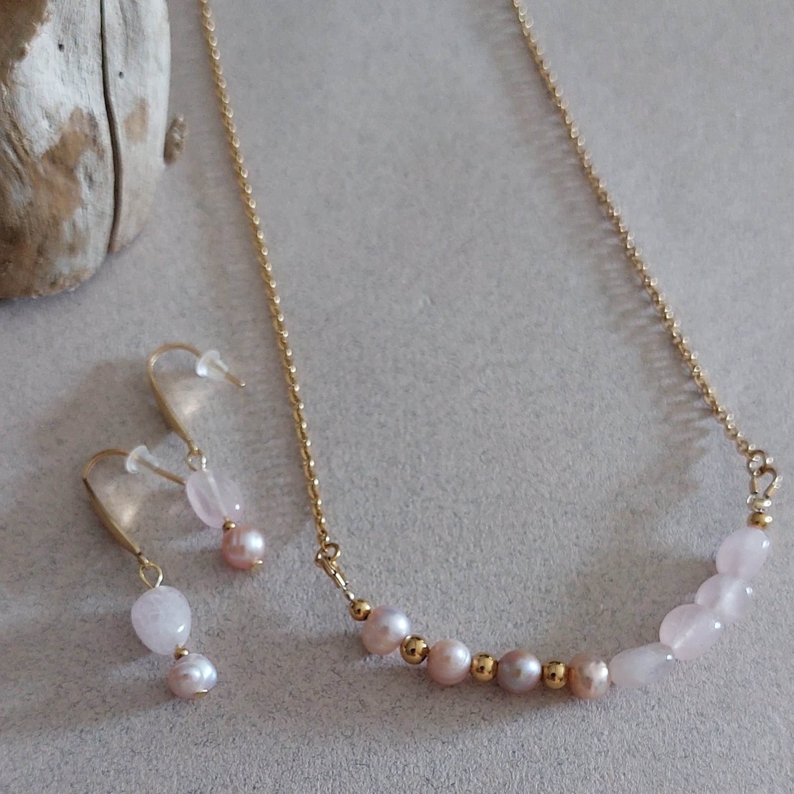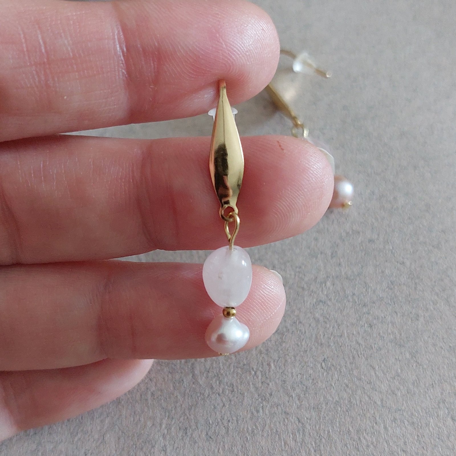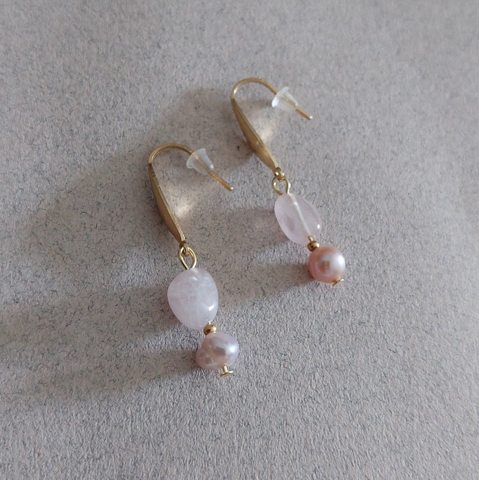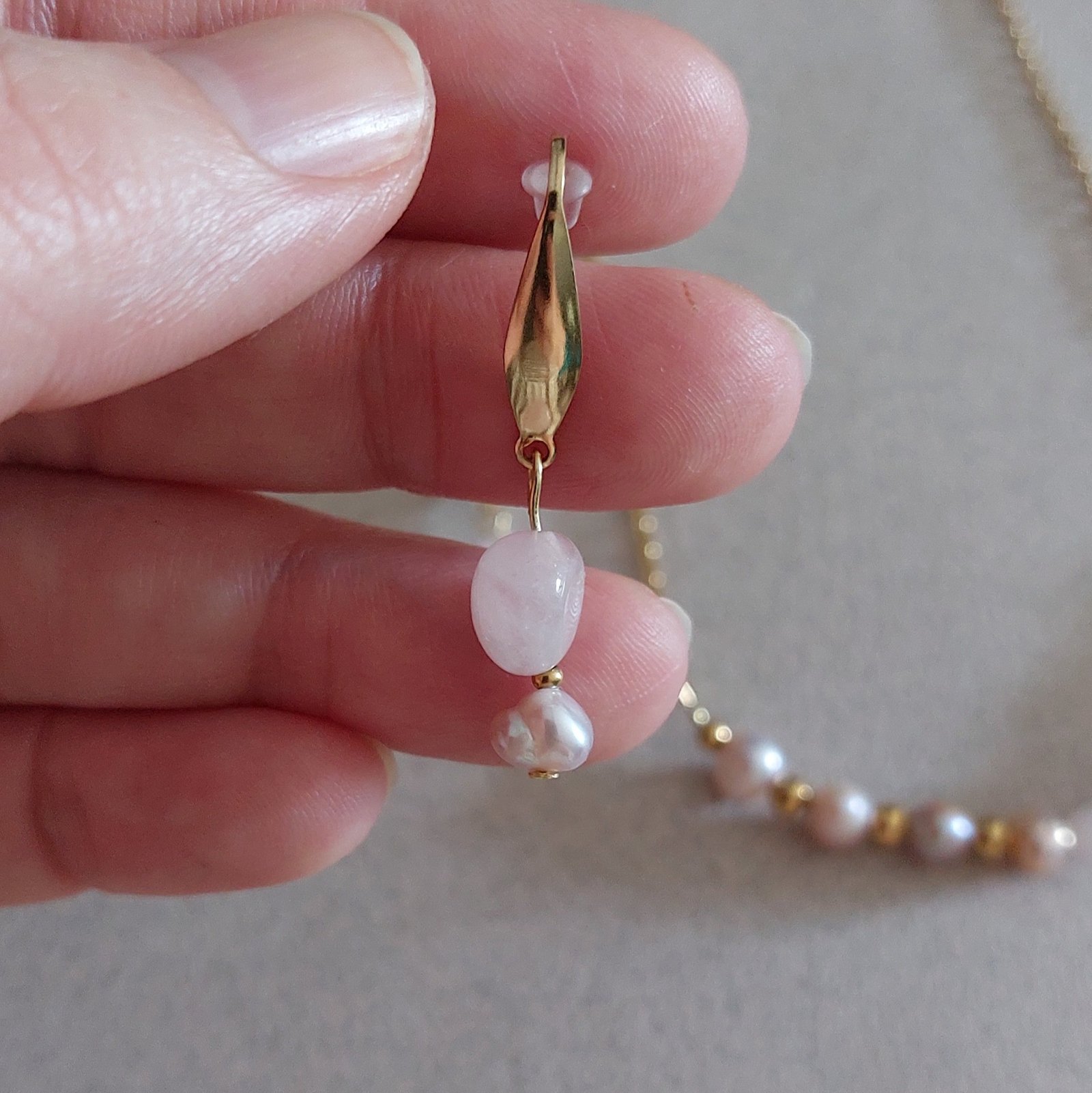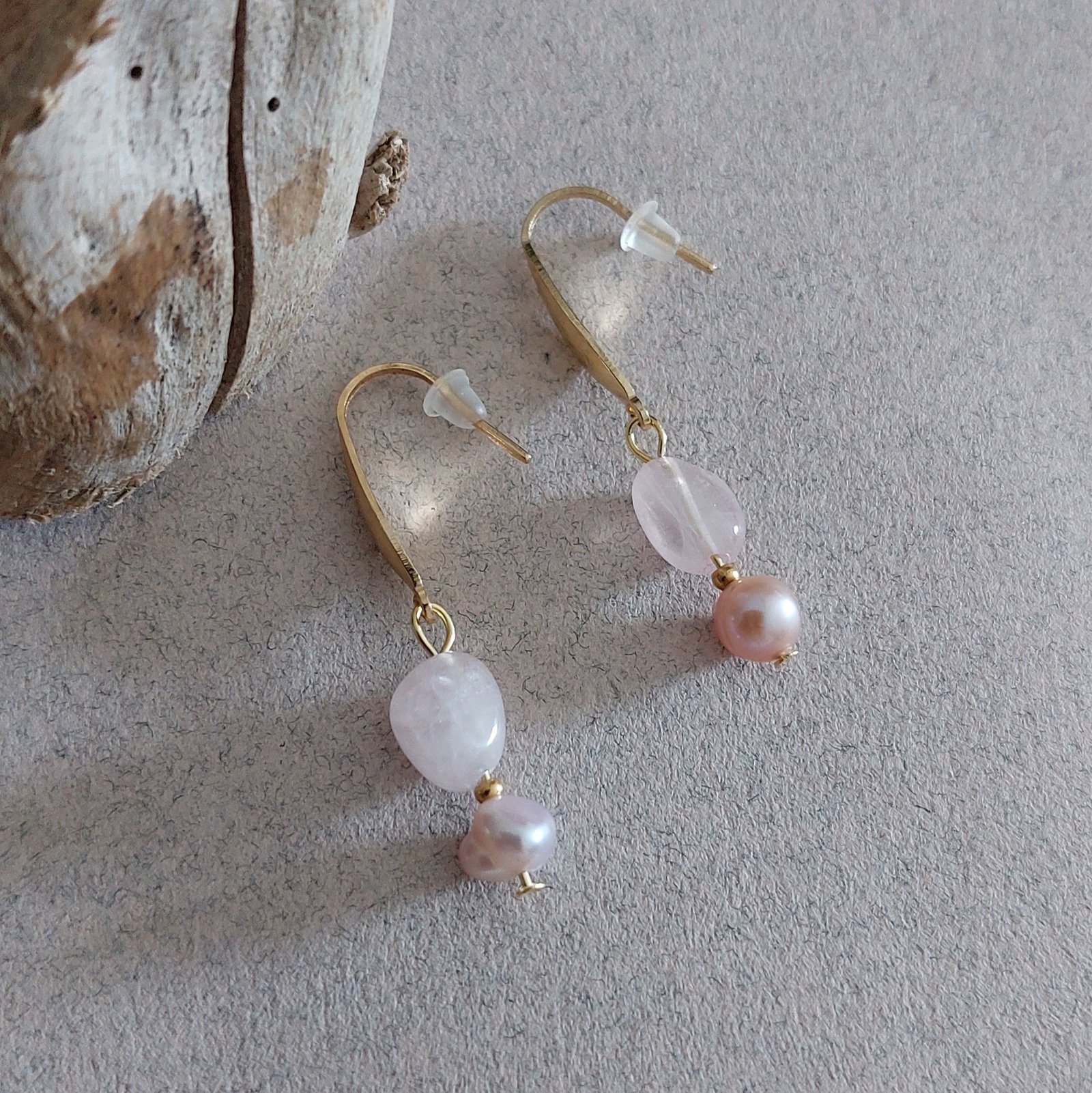 Élégantes et délicates, ces boucles d’oreilles mettent en valeur de magnifiques nuggets de quartz rose de Madagascar, sélectionnés pour leur douceur et leur teinte pastel naturellement lumineuse, ainsi de jolies perles naturelles nacrées.