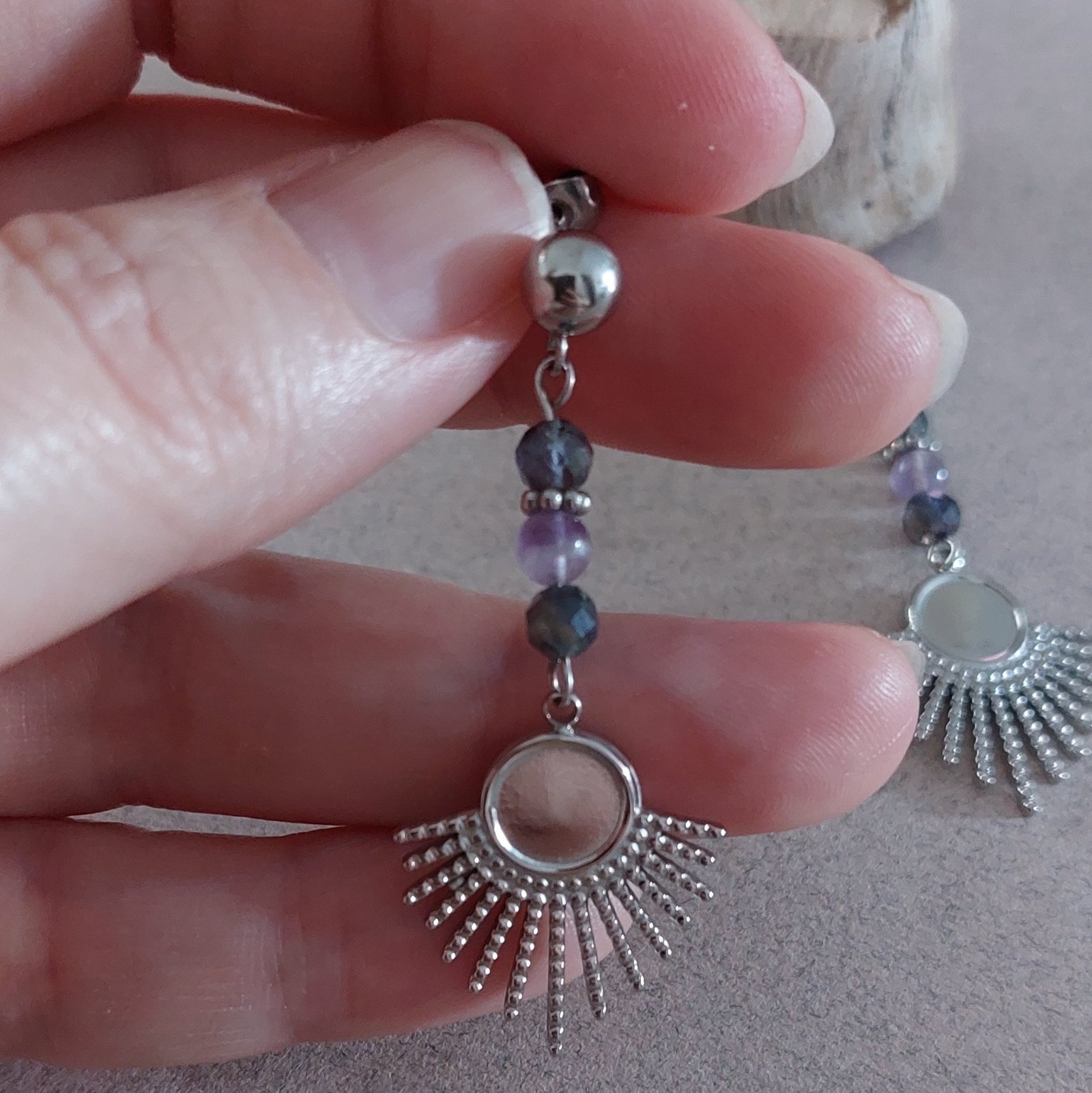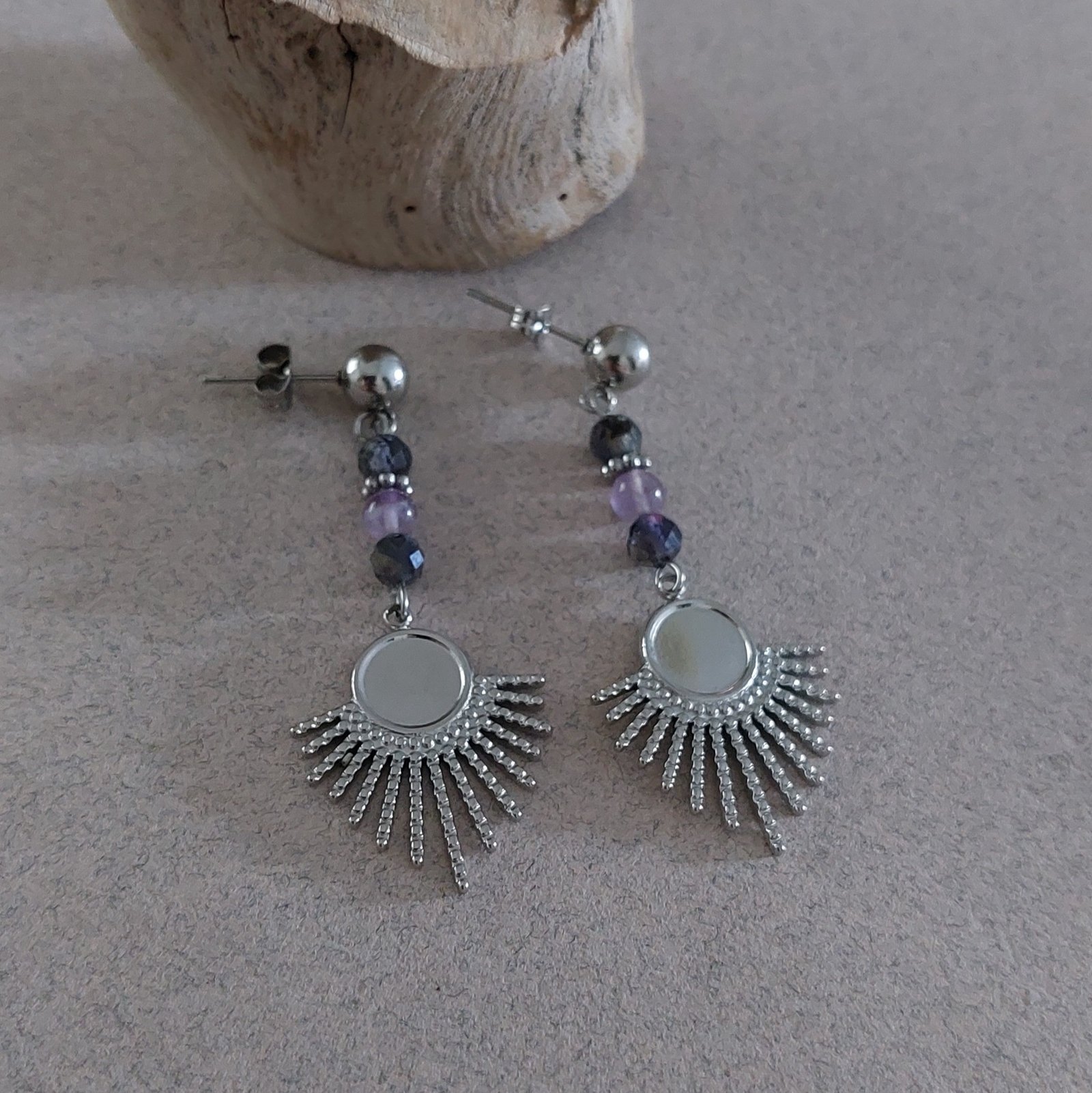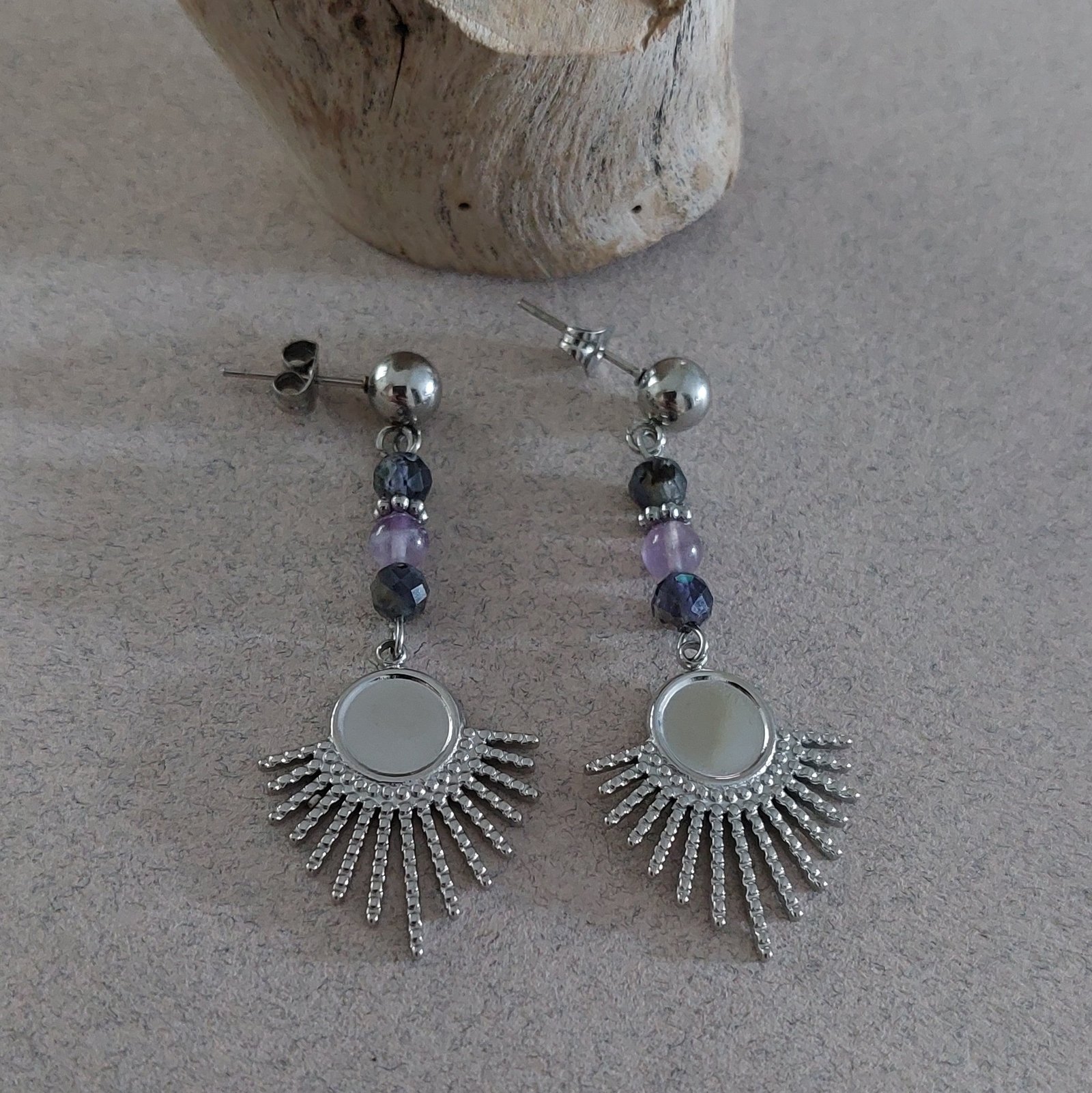 Ces jolies boucles en acier sont composées de perles d’améthyste et de cordiérite, dans les tons bleutés et violets.