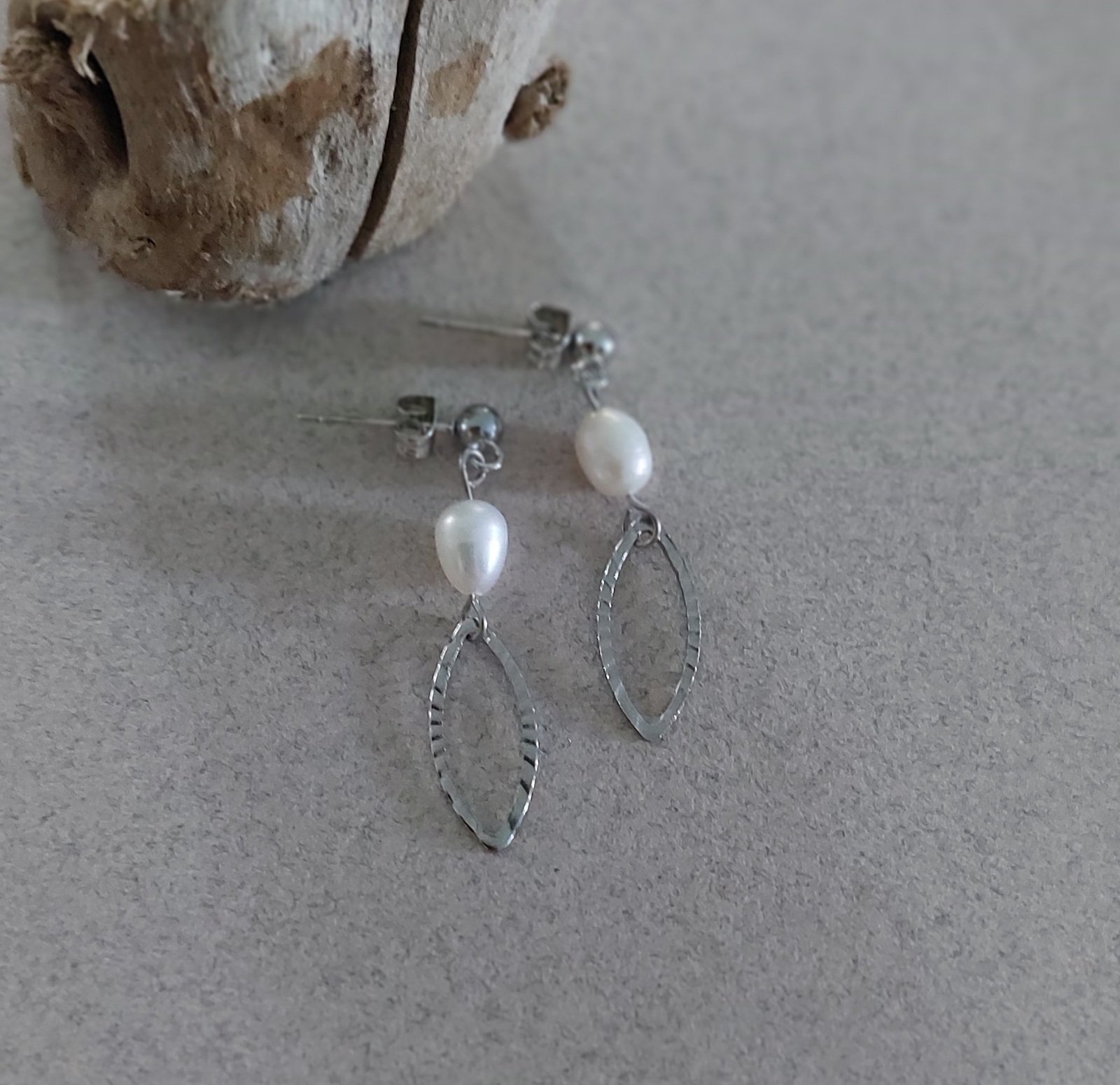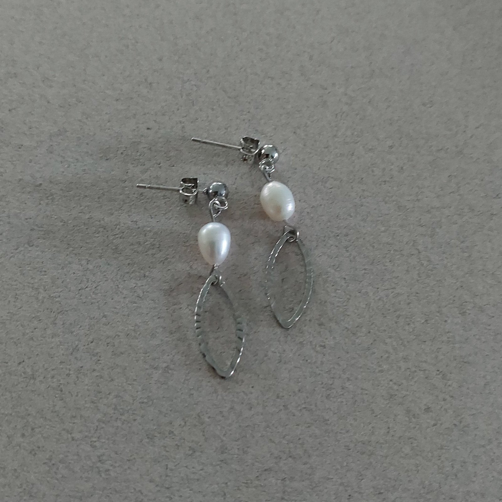 Chaque boucle est ornée d’une perle de forme légèrement baroque, ce qui en fait une pièce unique. L’ovale martelé en finition argentée apporte une modernité texturée à ce bijou intemporel.