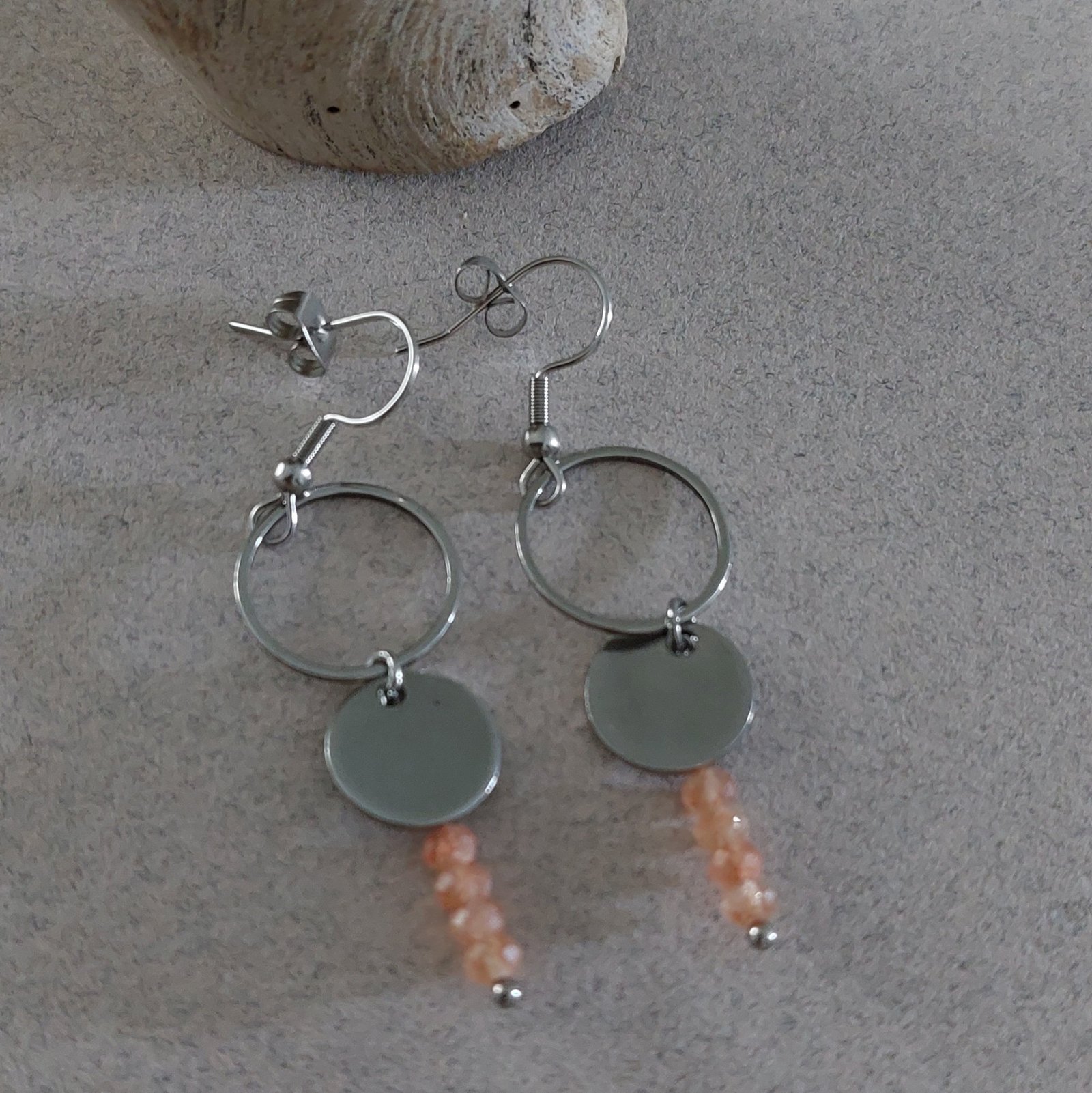 Ces petites boucles d’oreilles en acier se composent de évites perles facettées de pierre de soleil.