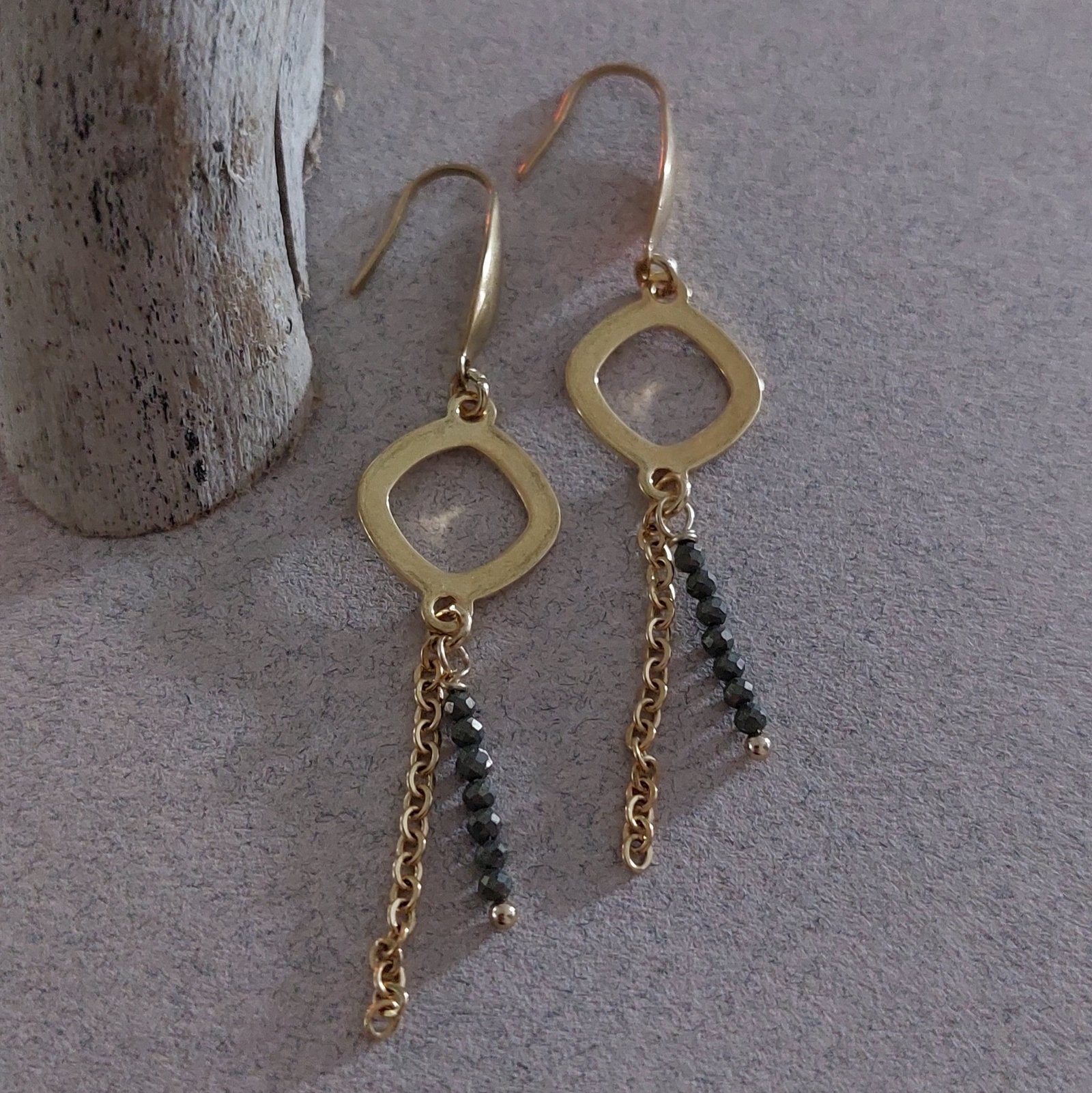 Ces jolies boucles d’oreilles tout en finesse, en acier doré se parent de micro perles de pyrite.