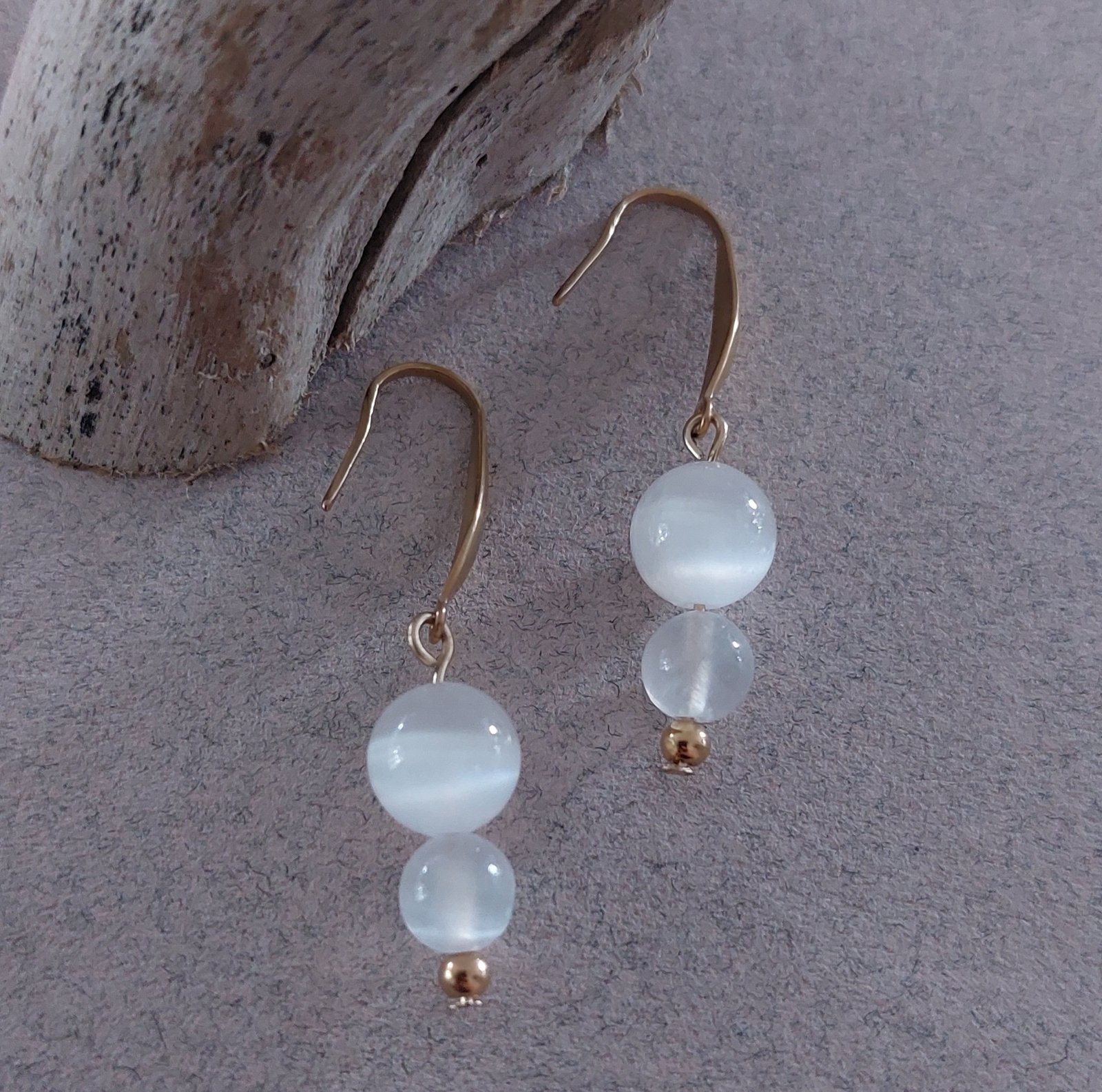 Ces boucles élégantes allient la lumière dorée de l’acier à l’éclat laiteux de la sélénite, pierre douce et apaisante.