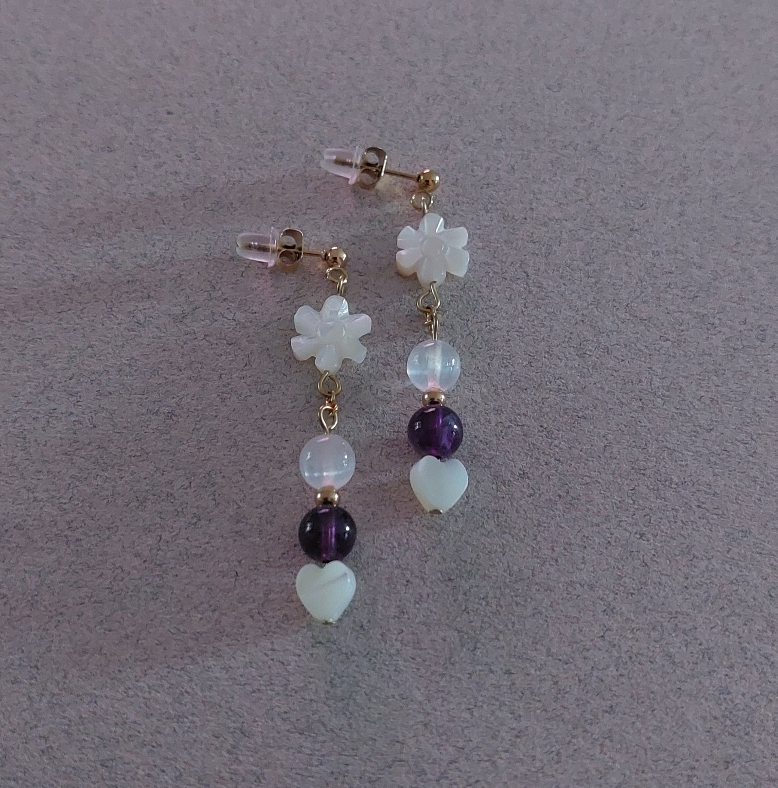 Ces boucles d’oreilles poétiques mêlant la nacre blanche en forme de fleur et l’améthyste violette naturelle sont une ode à la féminité, à l’intuition et à la beauté paisible. Chaque paire est assemblée à la main dans notre atelier, pour un rendu à la fois délicat, lumineux.
