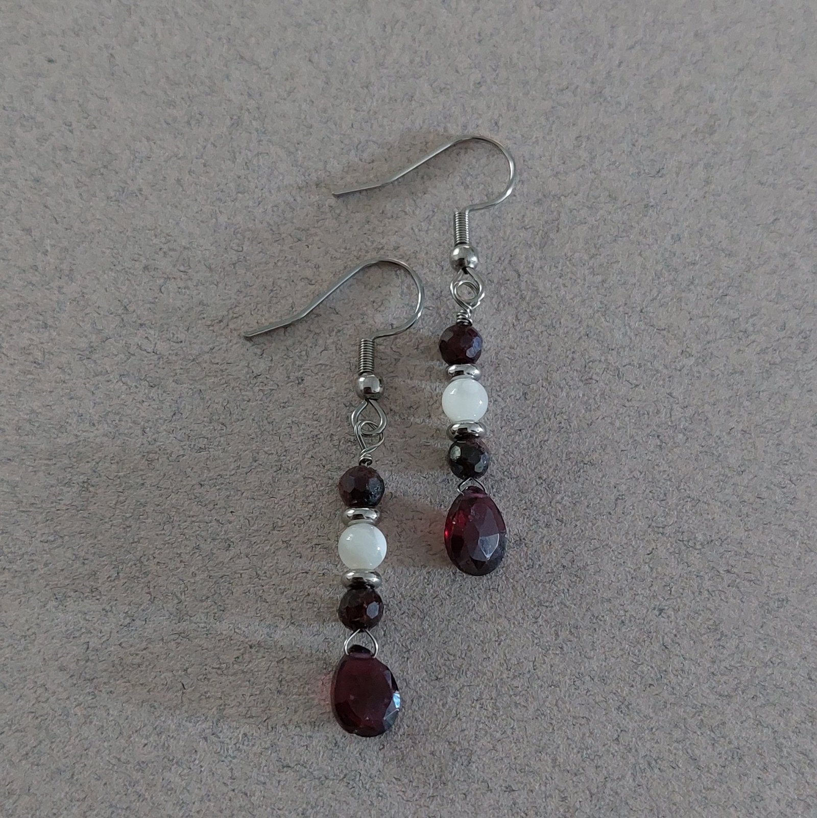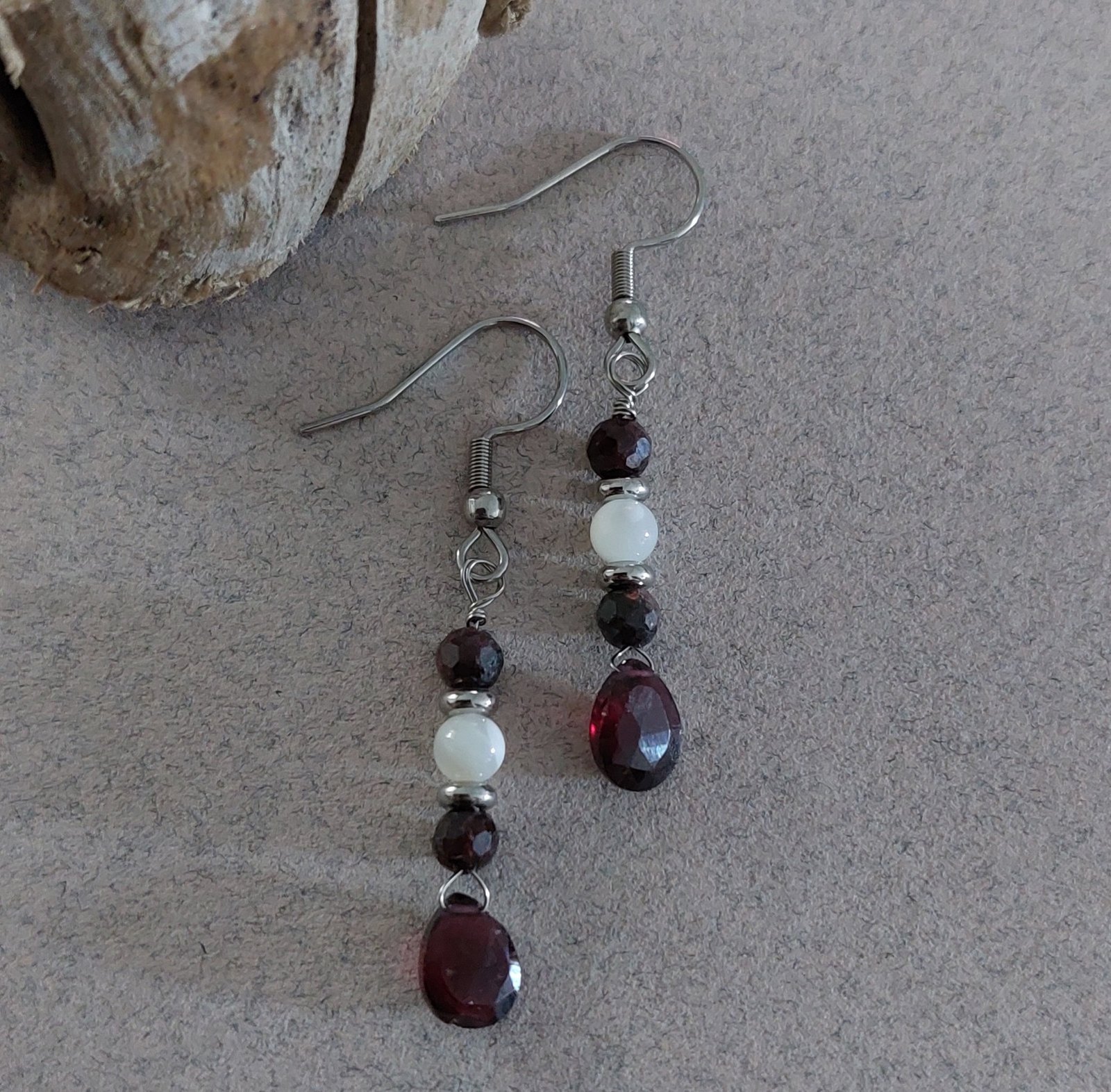 Ces jolies boucles d’oreilles en acier ont une note bordeau. Elles se parent de perles de grenat et de perles naturelles.