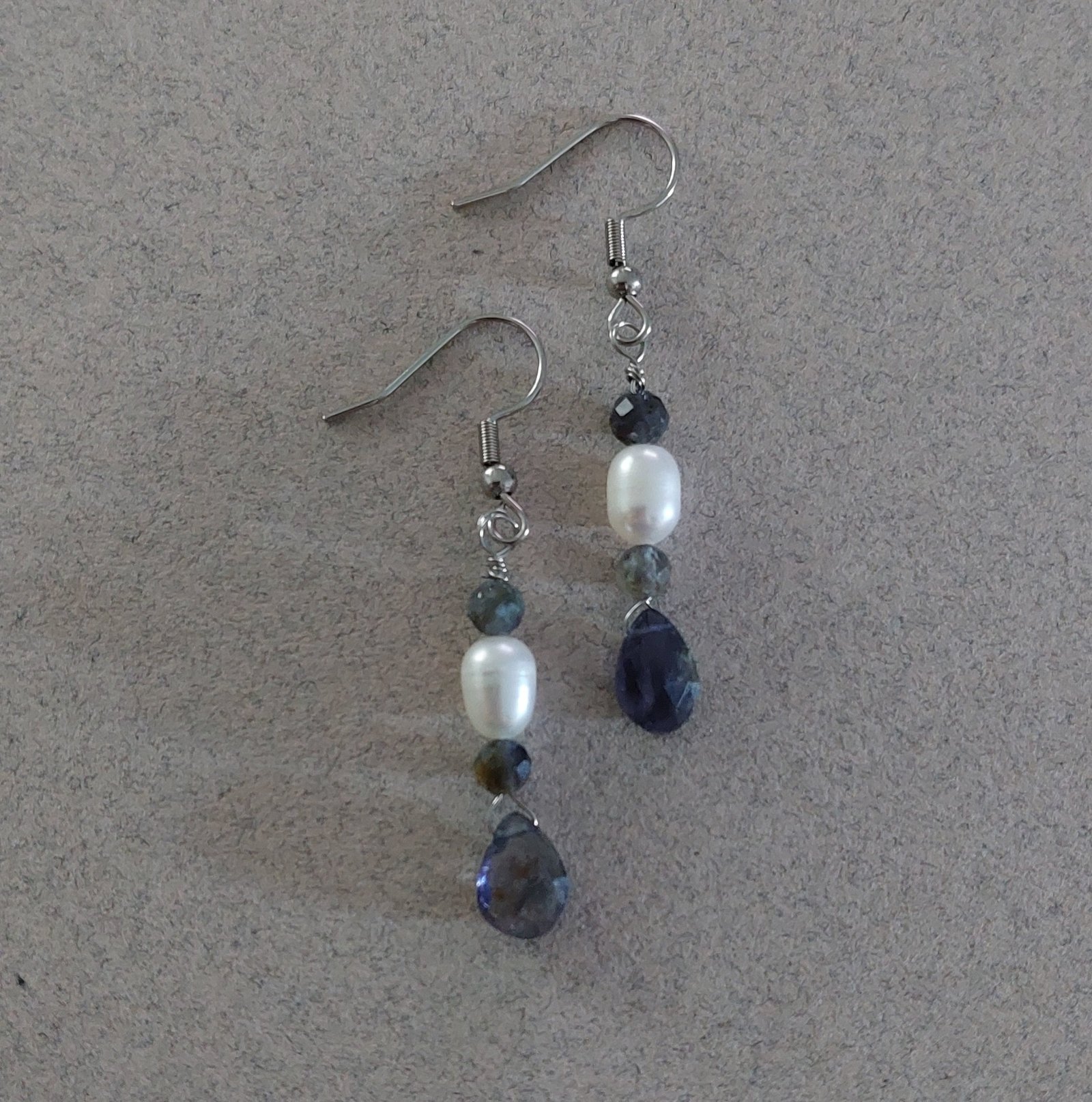 Ces boucles en acier ont une note bleutée violet grâce à la iolite. Un raffinement supplémentaire avec les perles naturelles.