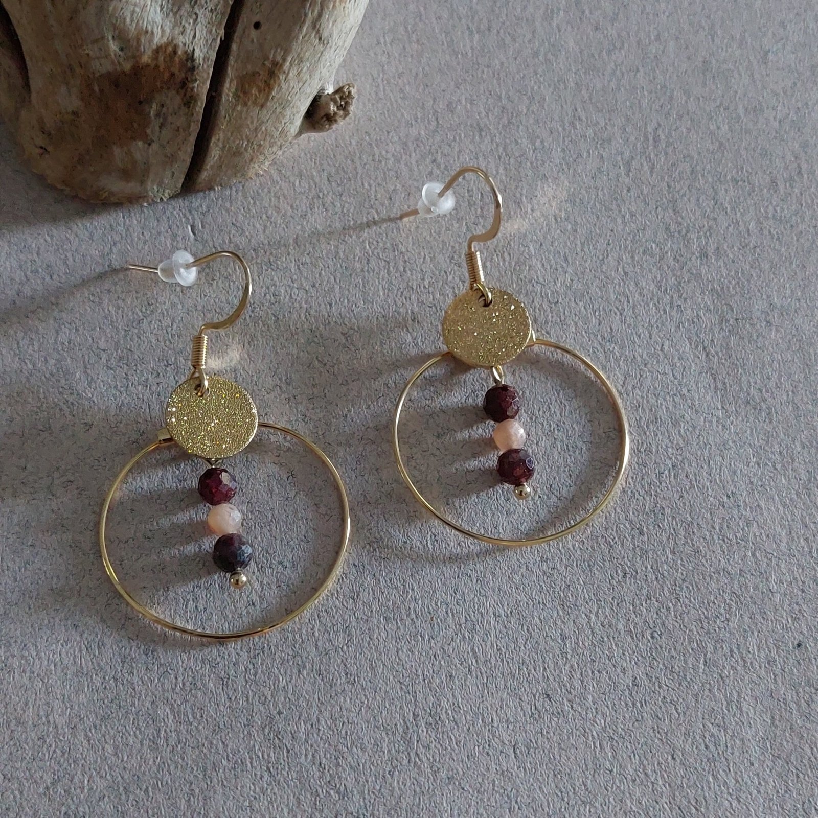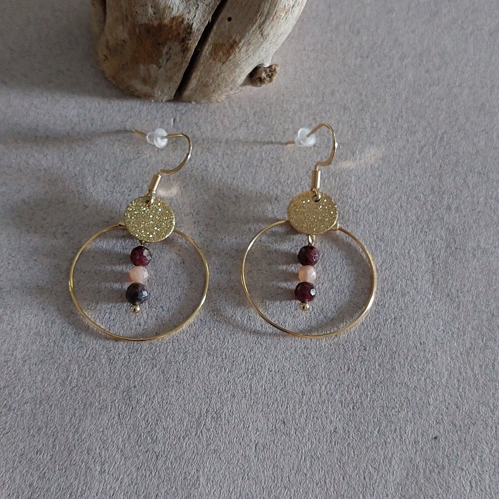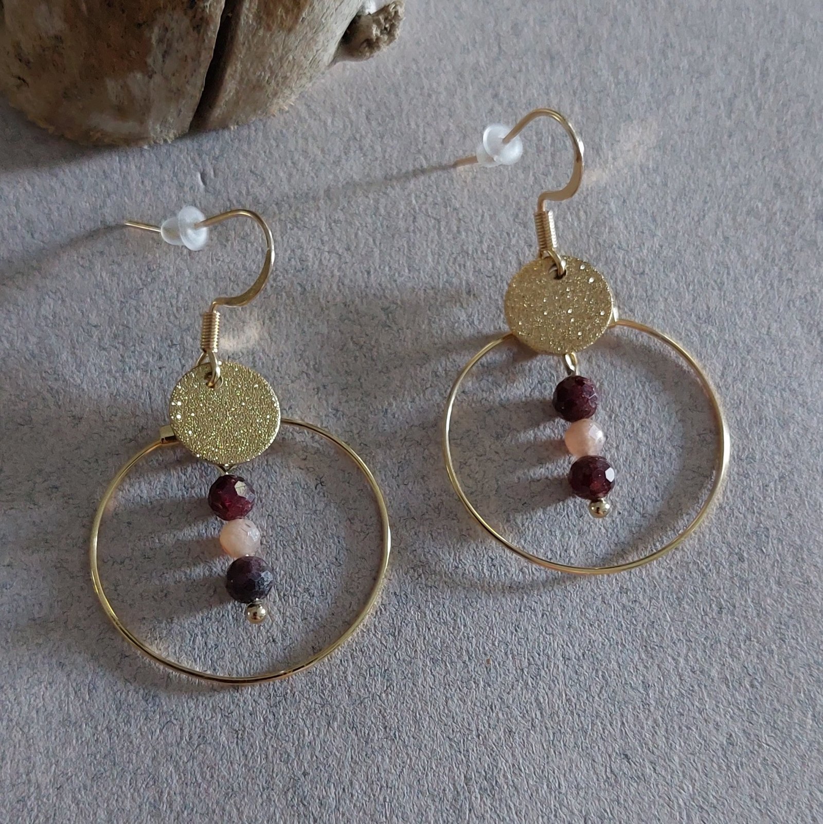 Chaque paire est ornée de perles facettées en grenat et pierre de lune, sélectionnées avec soin, offrant un bijou unique aux reflets subtils et changeants selon la lumière.