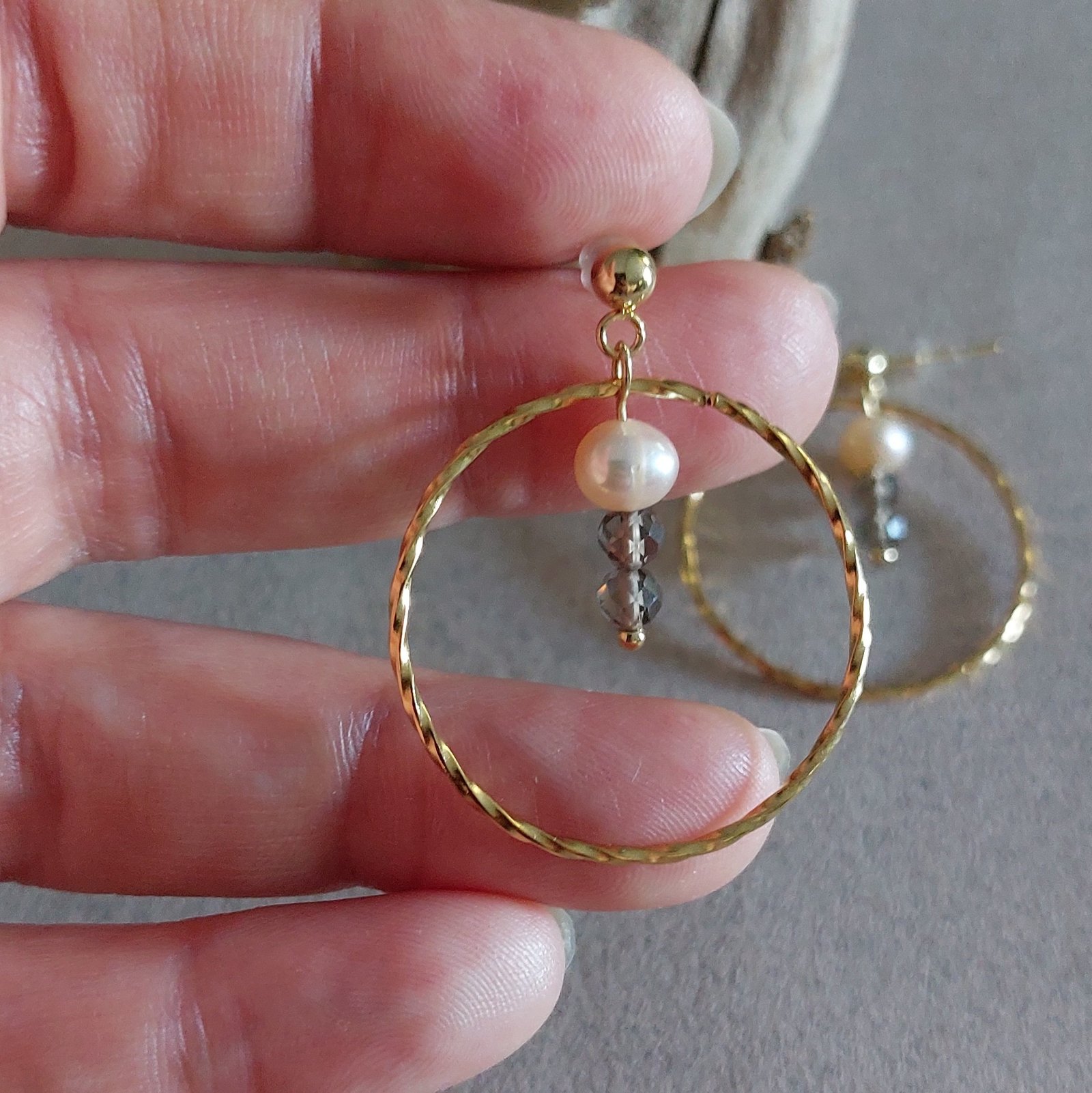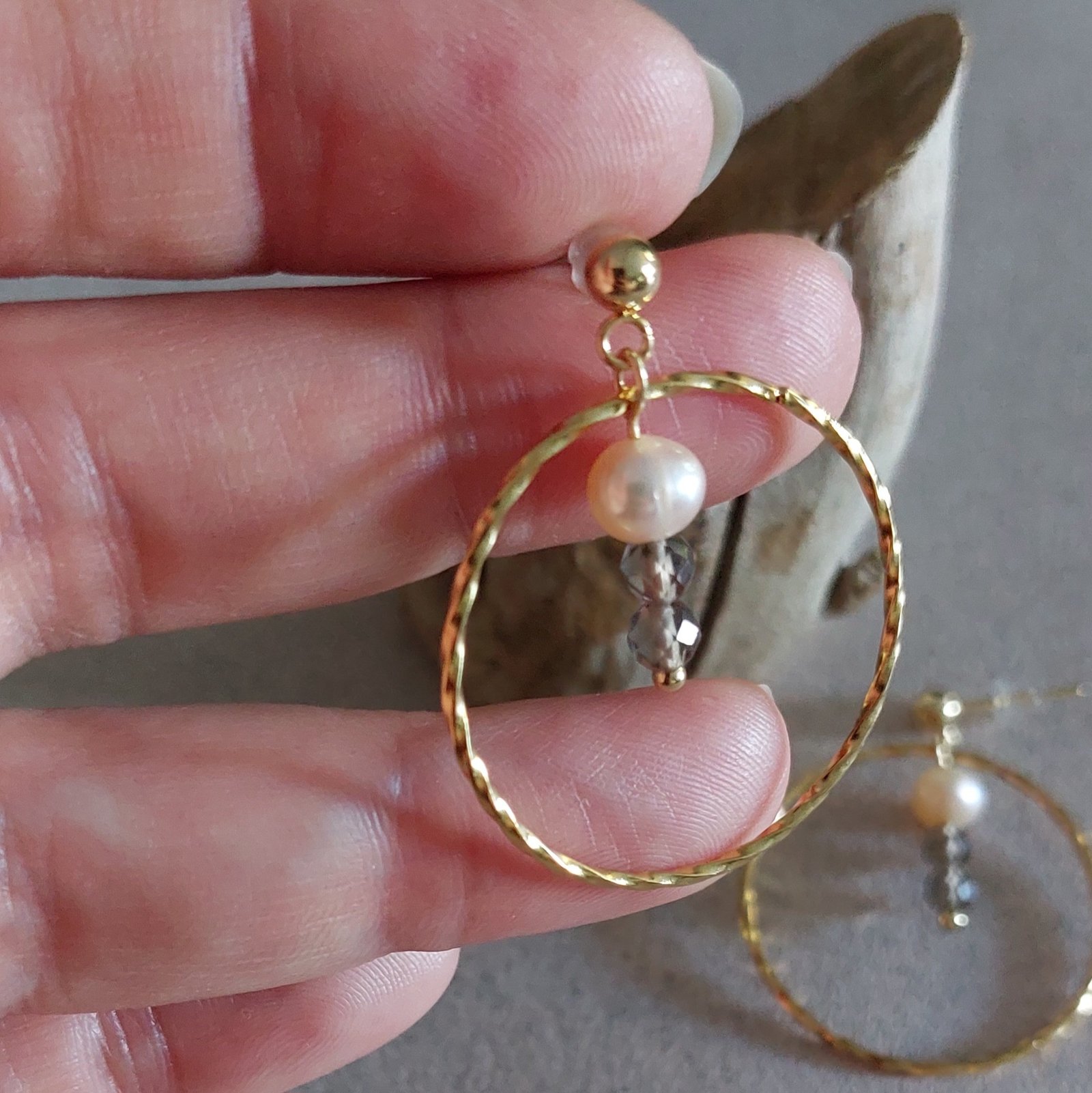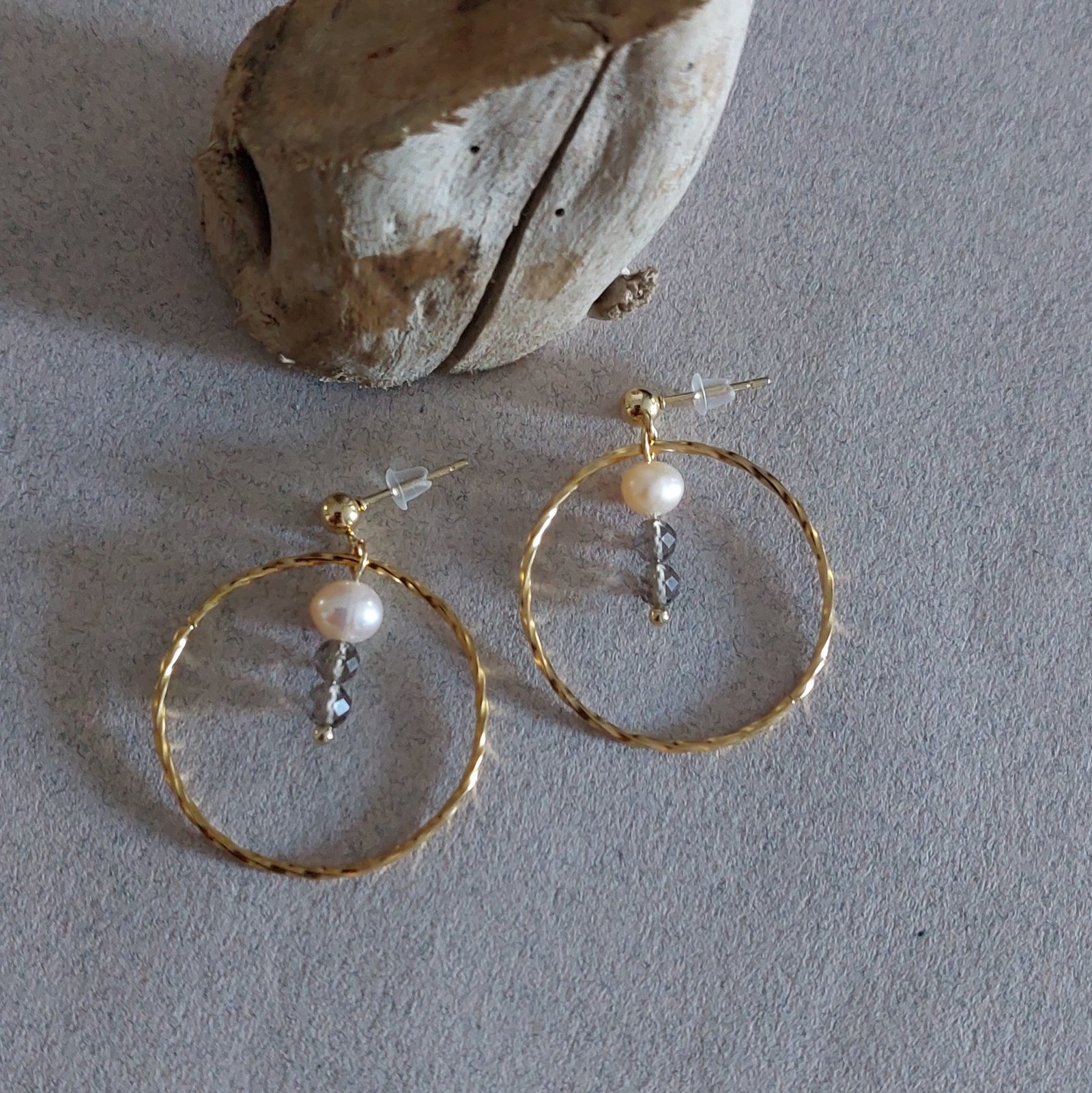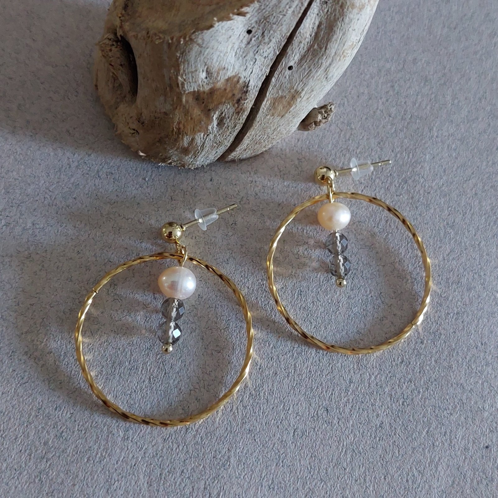 🤍 Boucles SÉPIA ▪︎ Acier doré ▪︎ Quartz fumé & perles naturelles