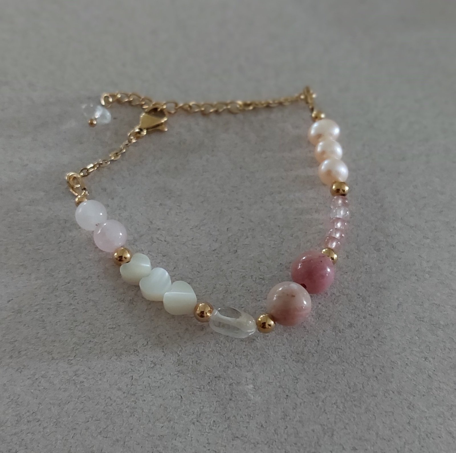 Pierres naturelles : Rhodonite 8 mm, quartz Fraise 2×4 mm, quartz rose 6 mm, perles & cœurs de nacre