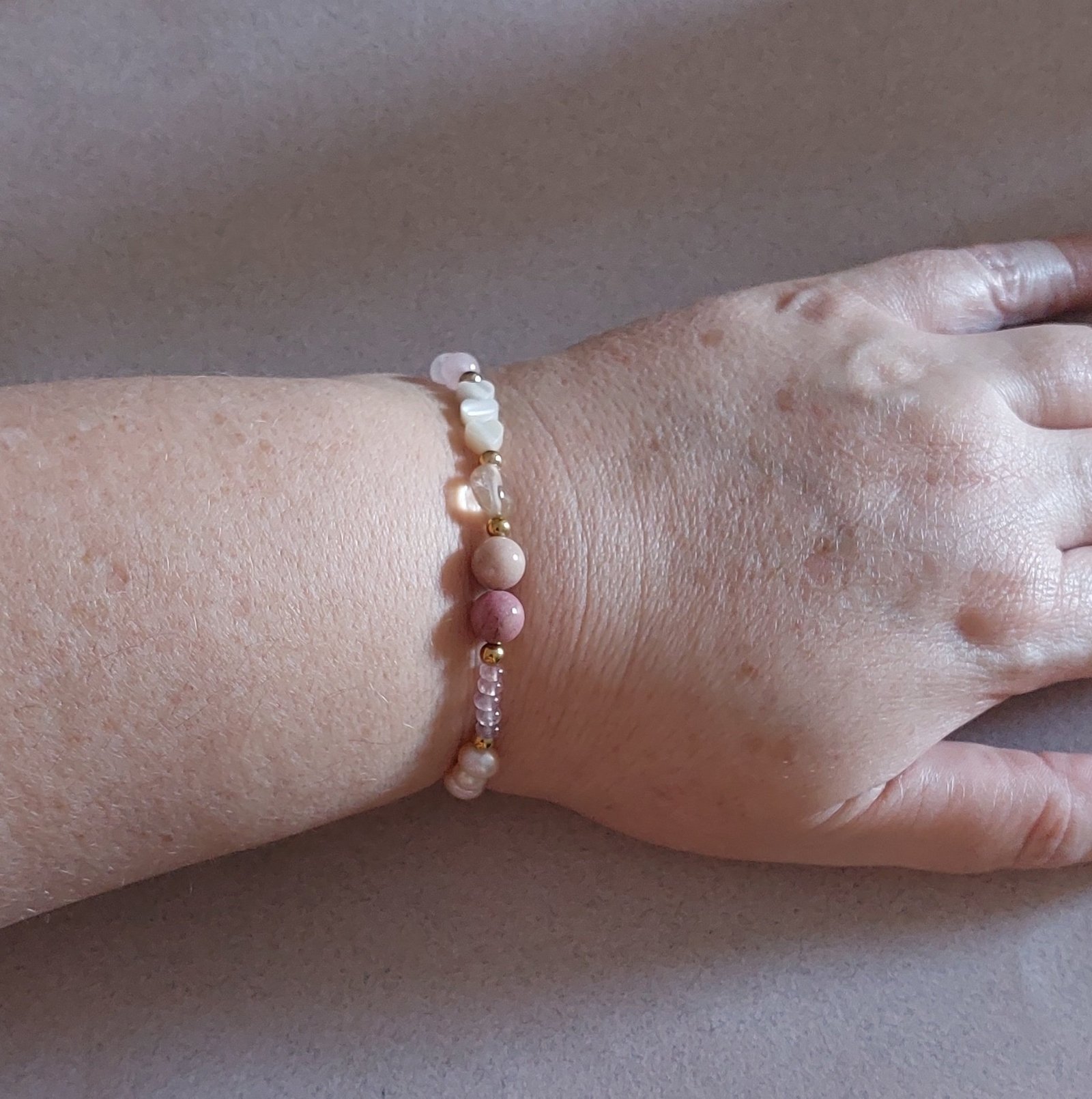 Ce bracelet incarne la tendresse, l’amour et la paix intérieure à travers une harmonie subtile de tons rosés et nacrés. La rhodonite, le quartz fraise, les perles naturelles et la nacre s’unissent pour diffuser une énergie d’amour bienveillant, de confiance et de sérénité.