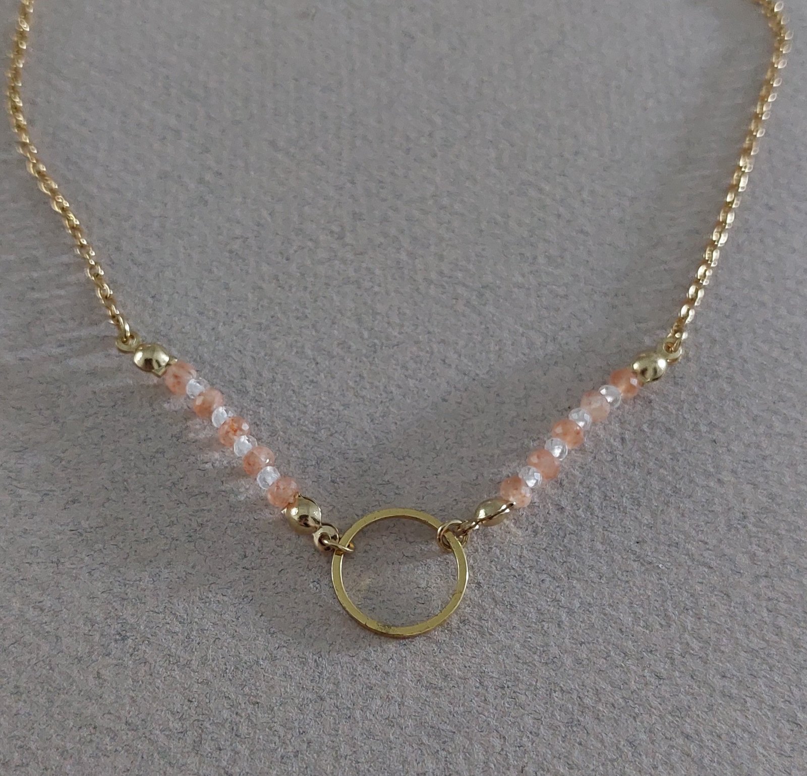 Si vous aimez le soleil, ce collier type « princesse » est fait pour vous, il est en acier doré et perles de pierre de soleil, grade A.
