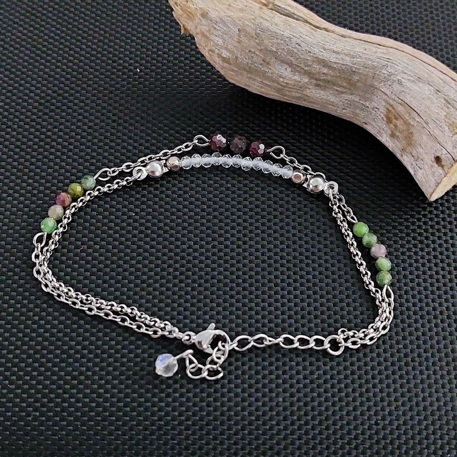 Ce bracelet double rang en acier est composé de perles de cristal, de rubis fuschite et de grenat.