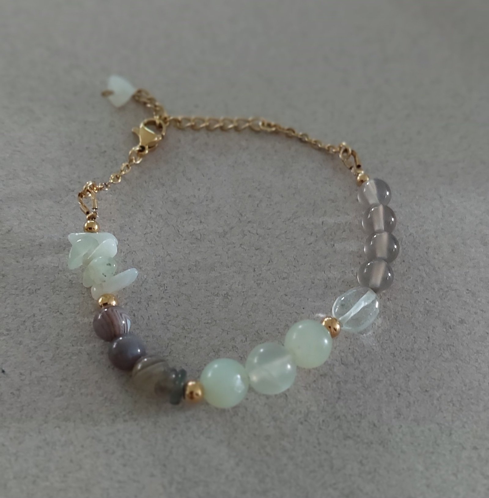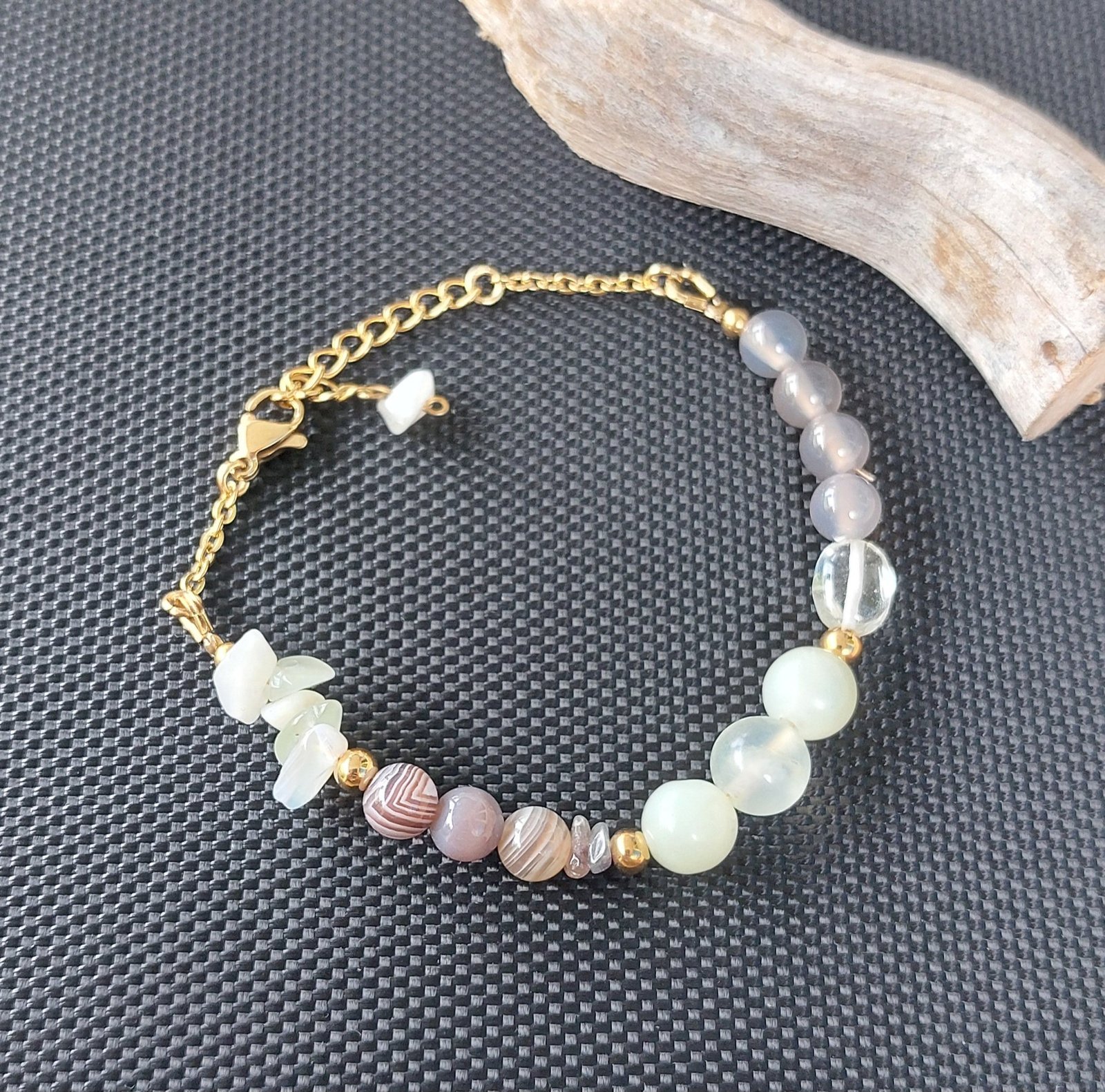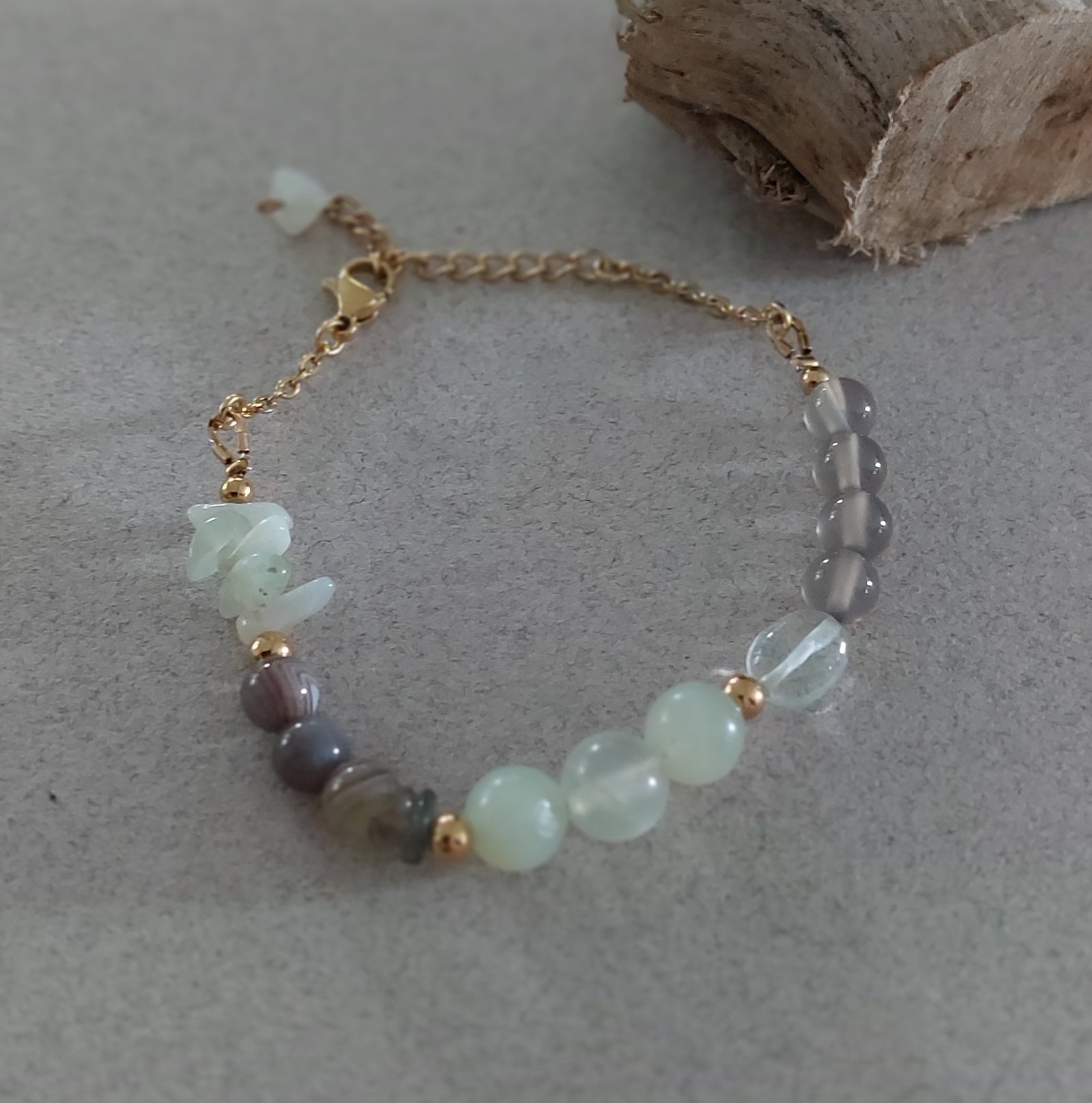 Bracelet Harmonia – Préhnite, Agate du Botswana & Calcédoine Grise