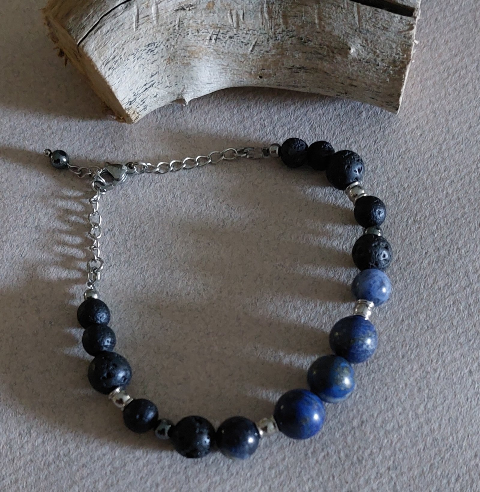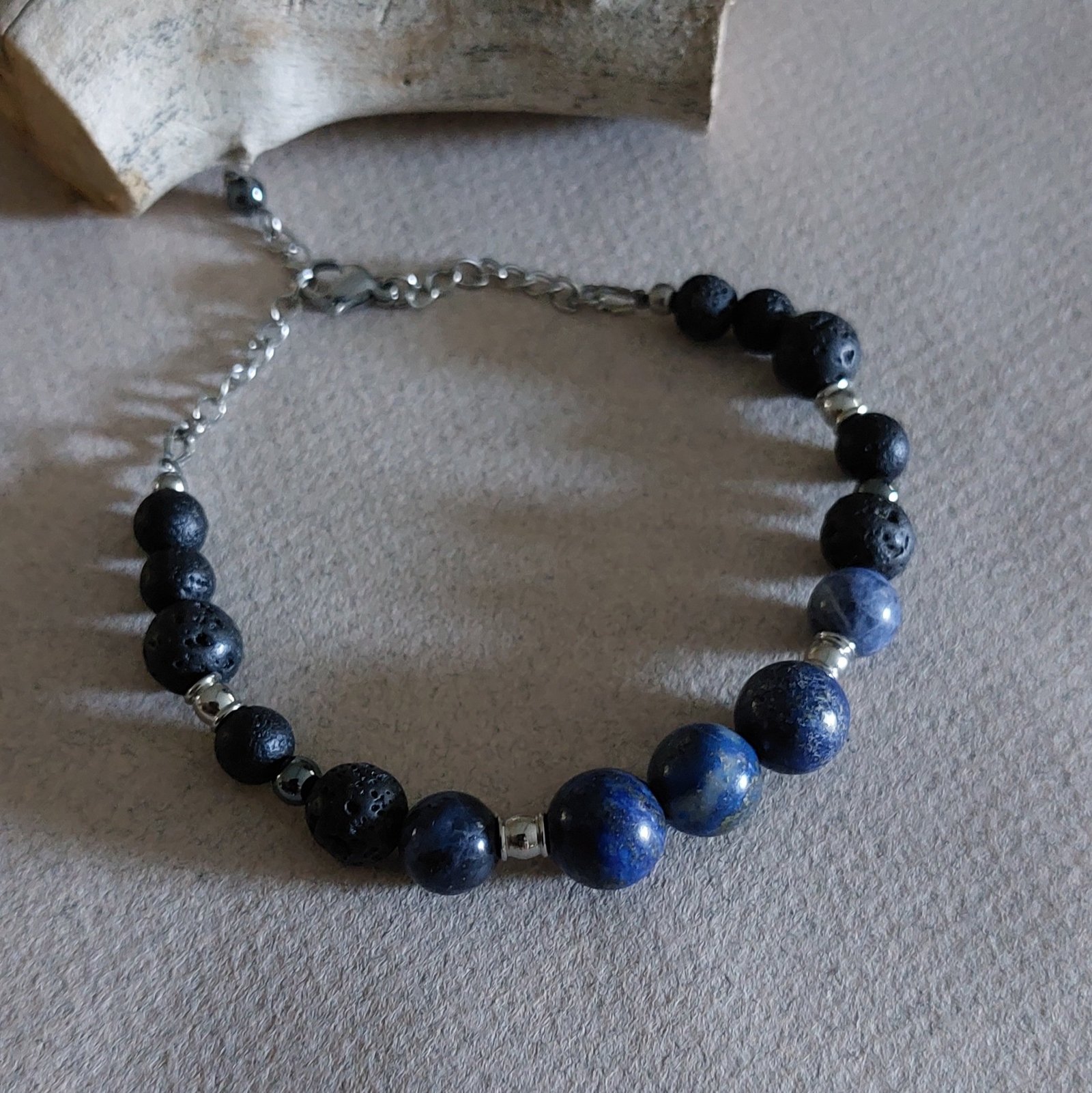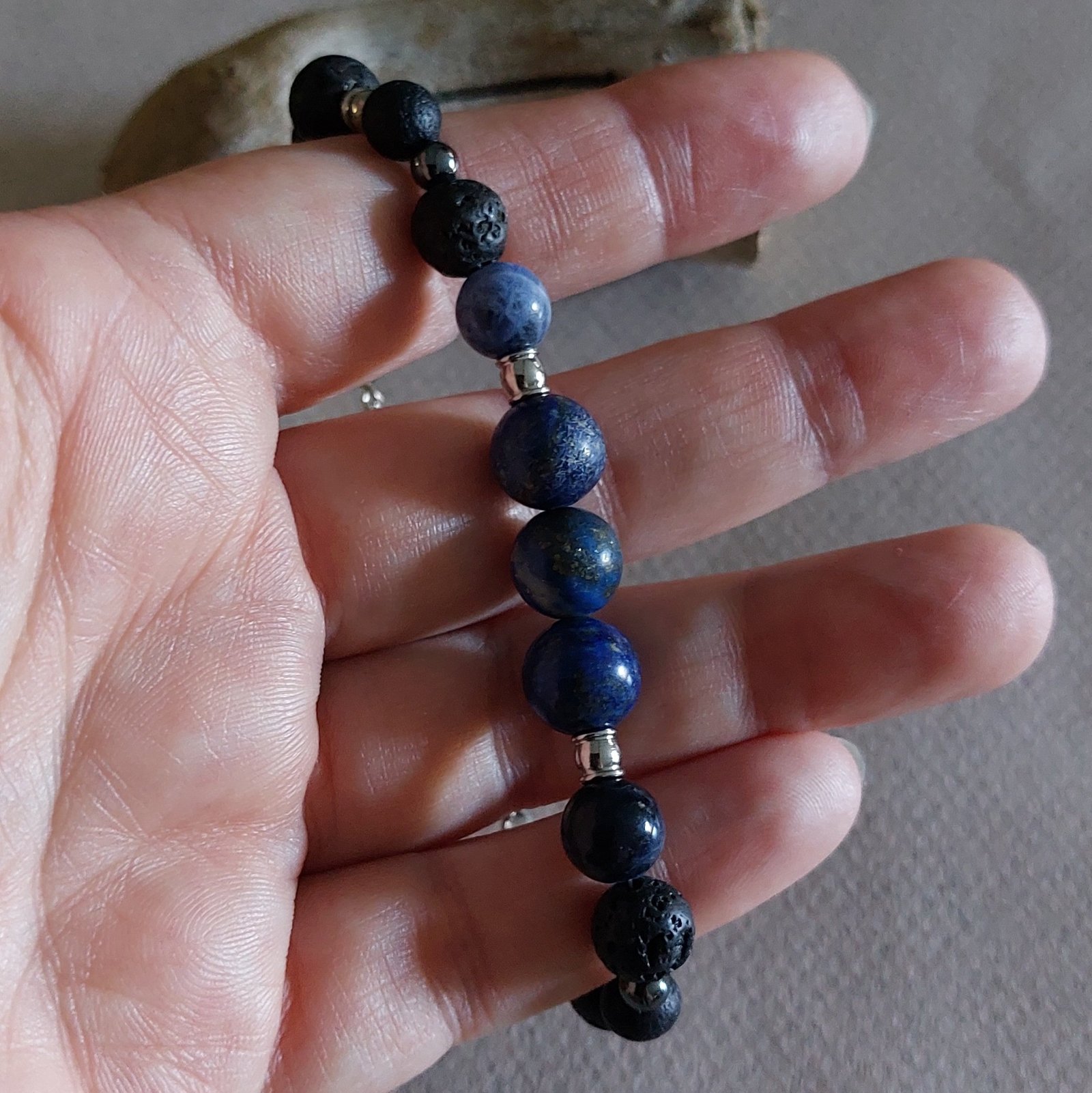 Ce bracelet associe la profondeur du lapis-lazuli, la douceur apaisante de la sodalite et l’énergie brute des pierres de lave, pour une création à la fois élégante et authentique.