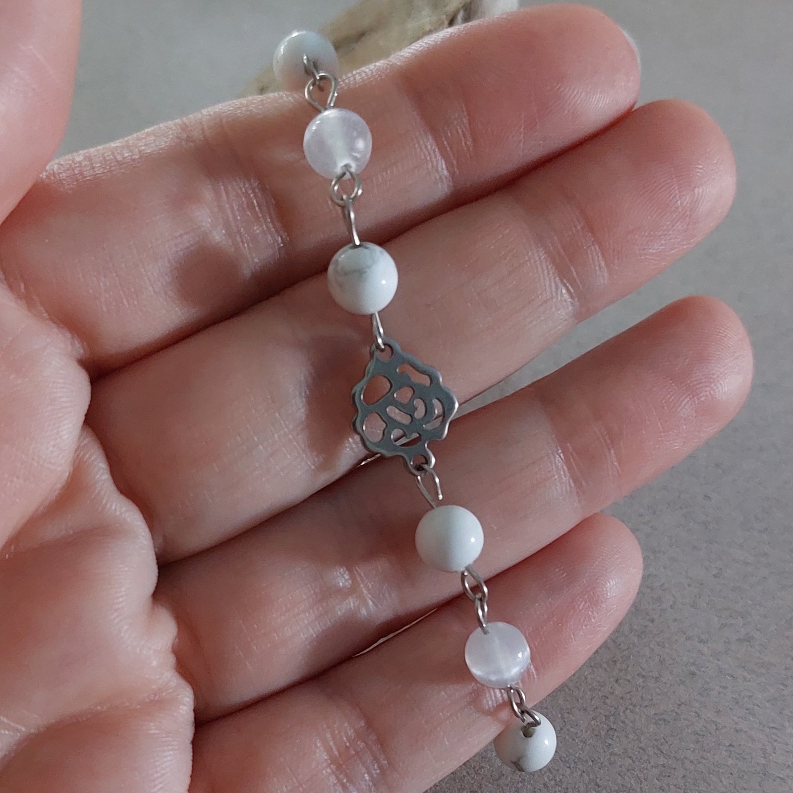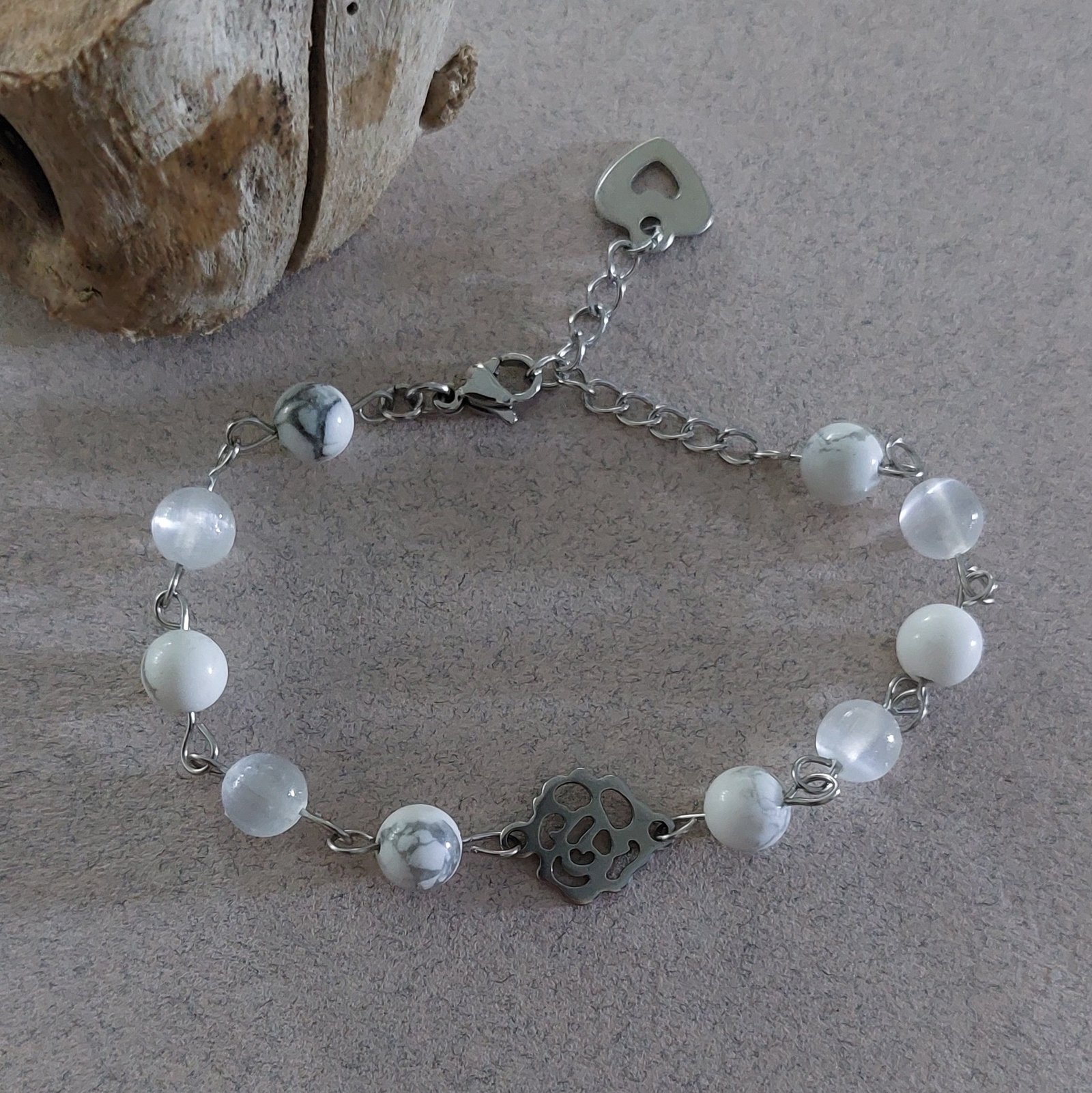 Ce bracelet en acier dans les tons blancs met la howlite et la sélénite en avant. Il est réhaussé d’une petite rose.