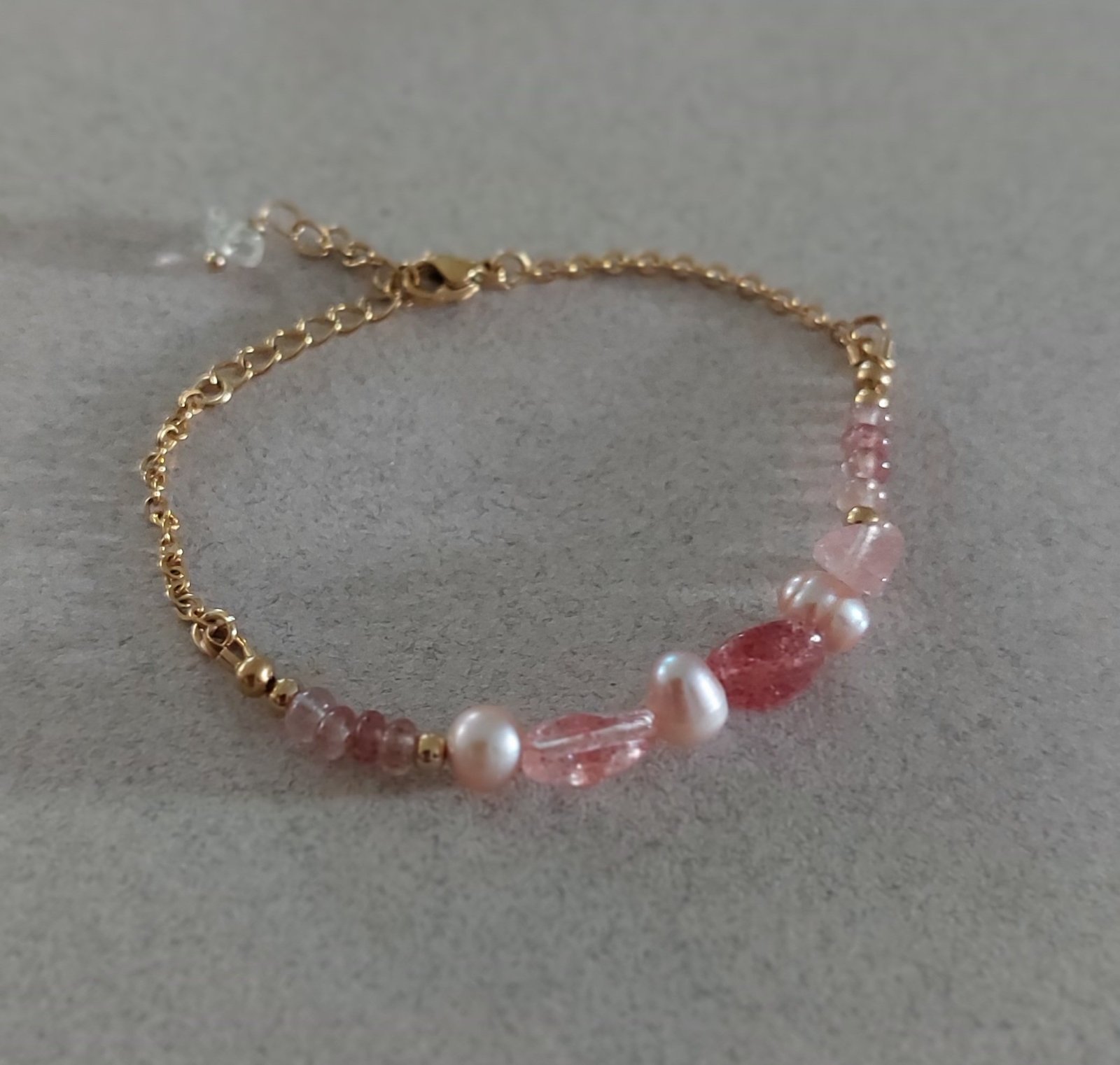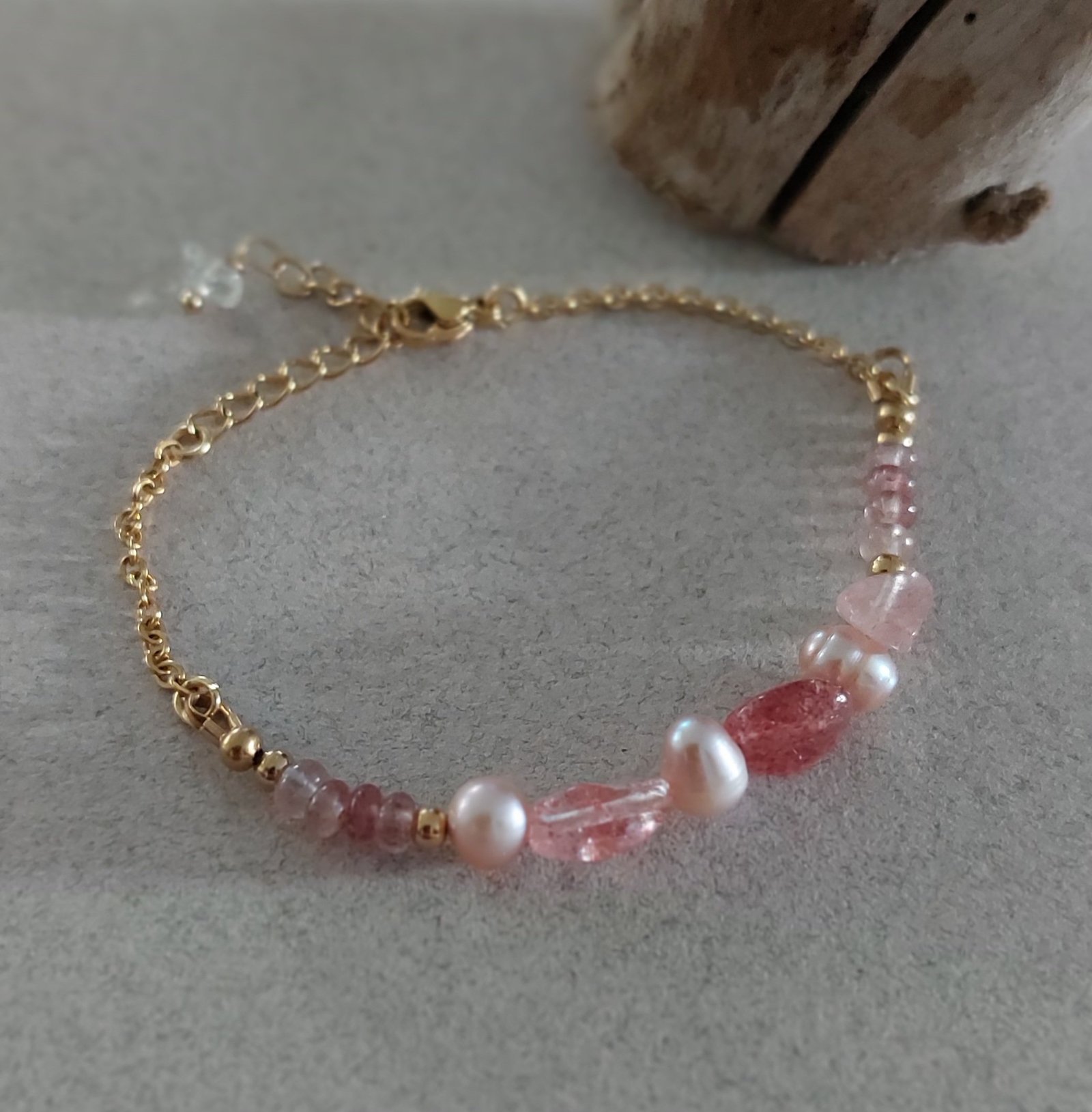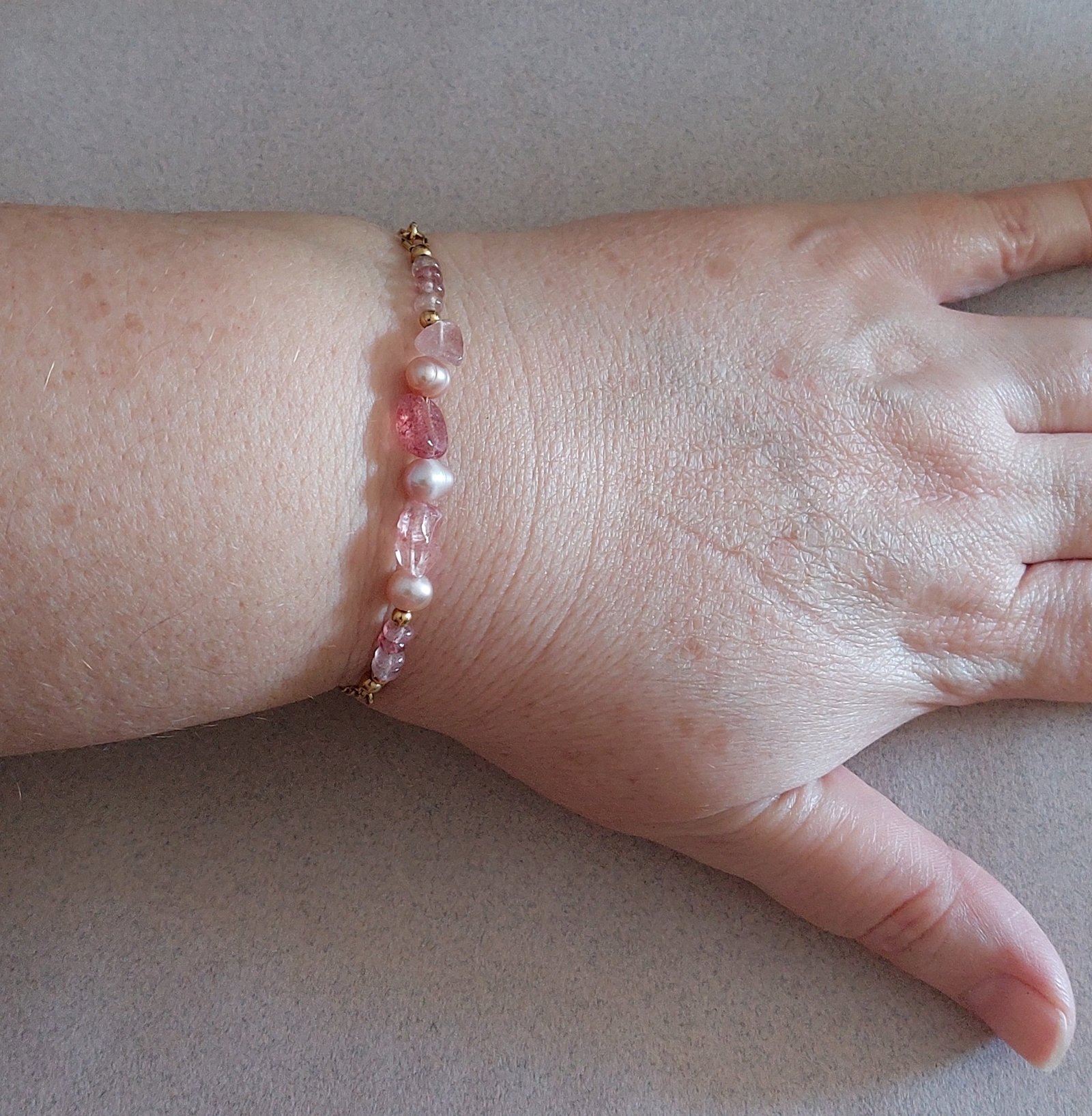Élégant, féminin et symbolique, ce bracelet en quartz fraise et perles est une invitation à la tendresse et à la sérénité. Il allie l’énergie bienveillante du quartz fraise à la pureté lumineuse des perles naturelles, dans un bijou raffiné.