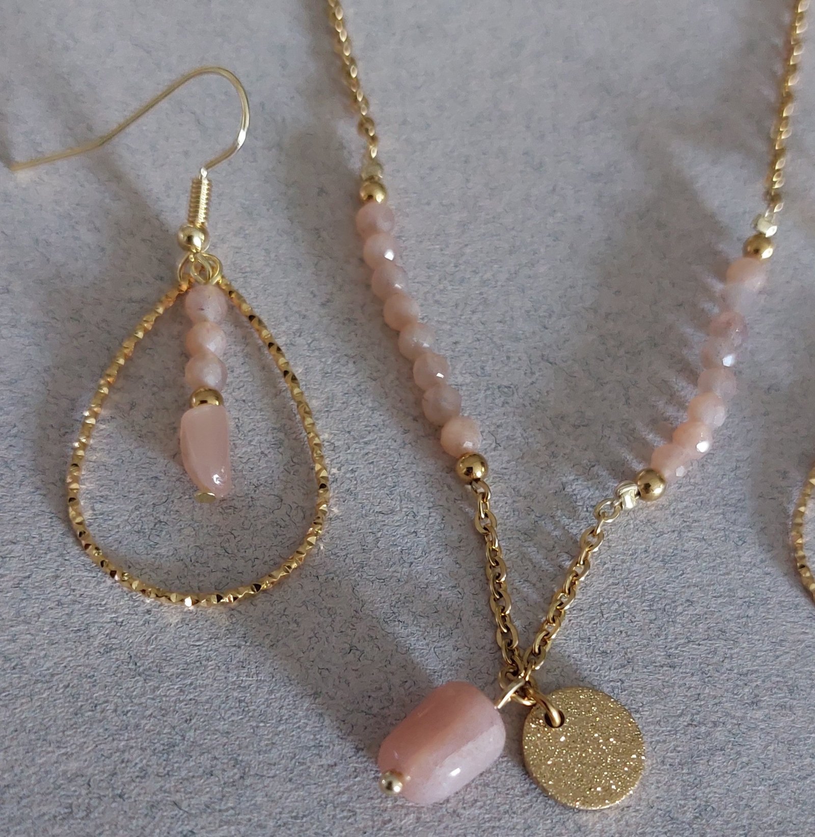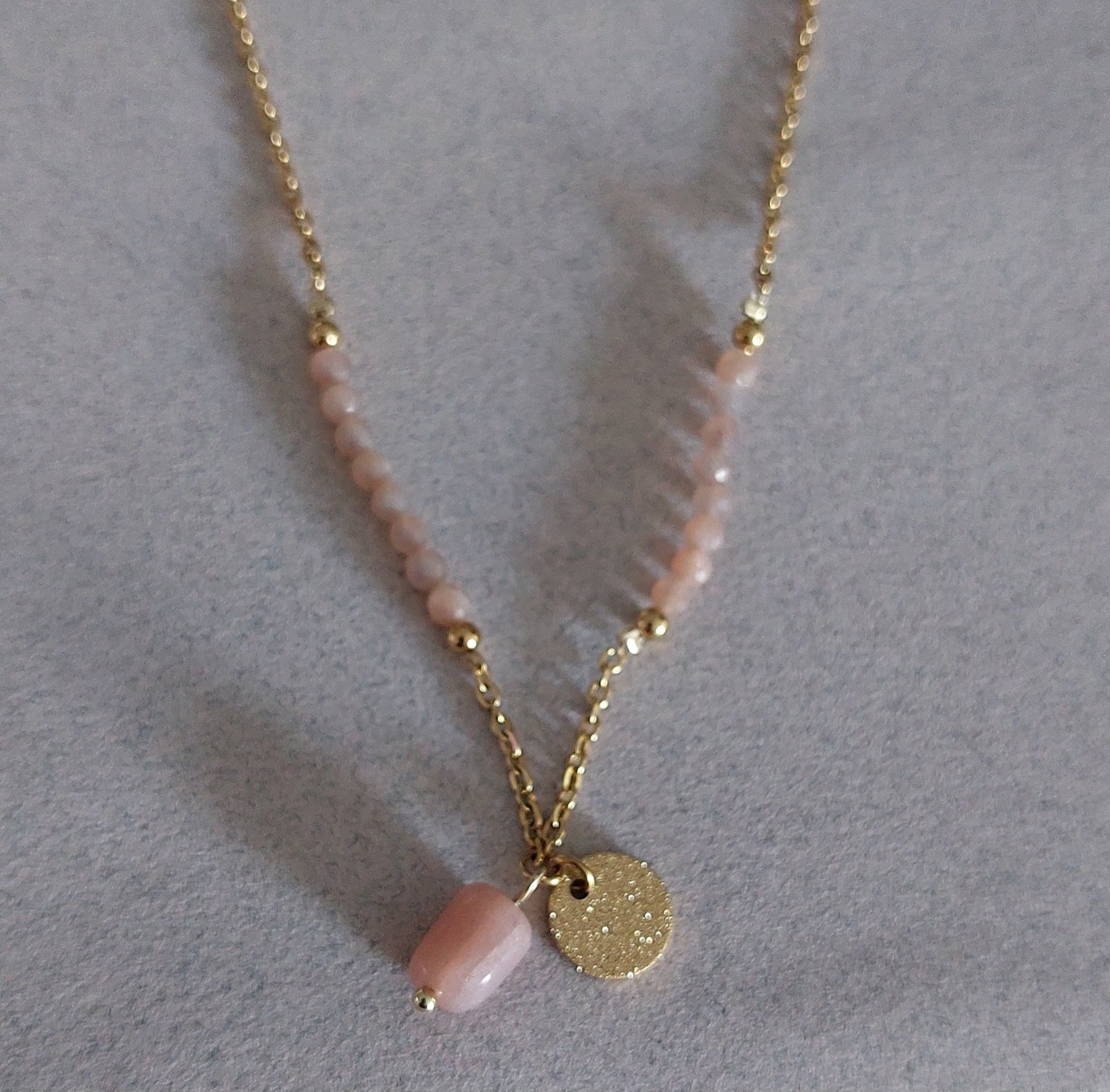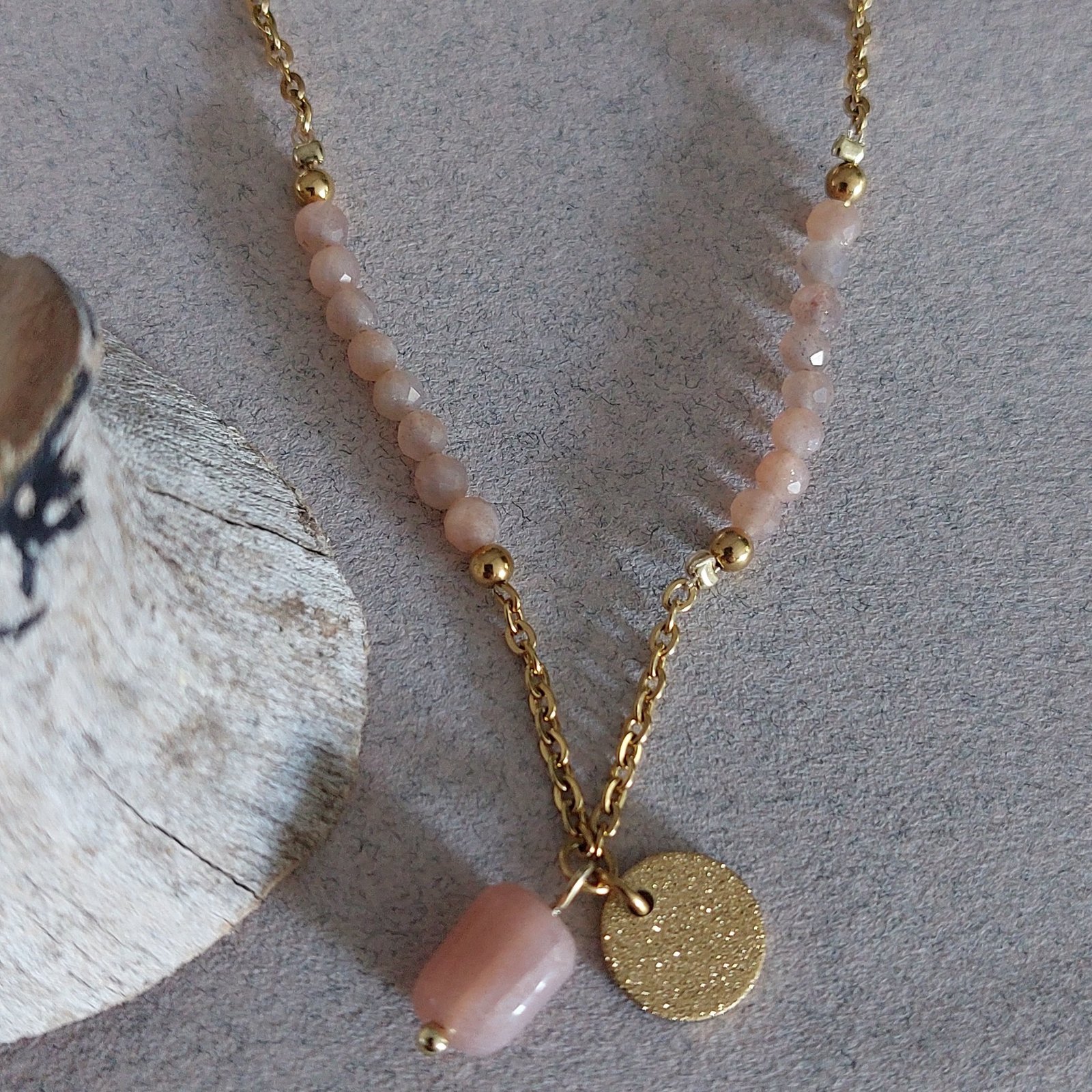 Ce collier en pierre de lune pêche rayonne d’une lumière tendre et chaleureuse. Sa teinte délicatement rosée évoque la douceur du coucher de soleil, l’apaisement et la féminité intérieure. Il offre un éclat lumineux tout en restant durable.