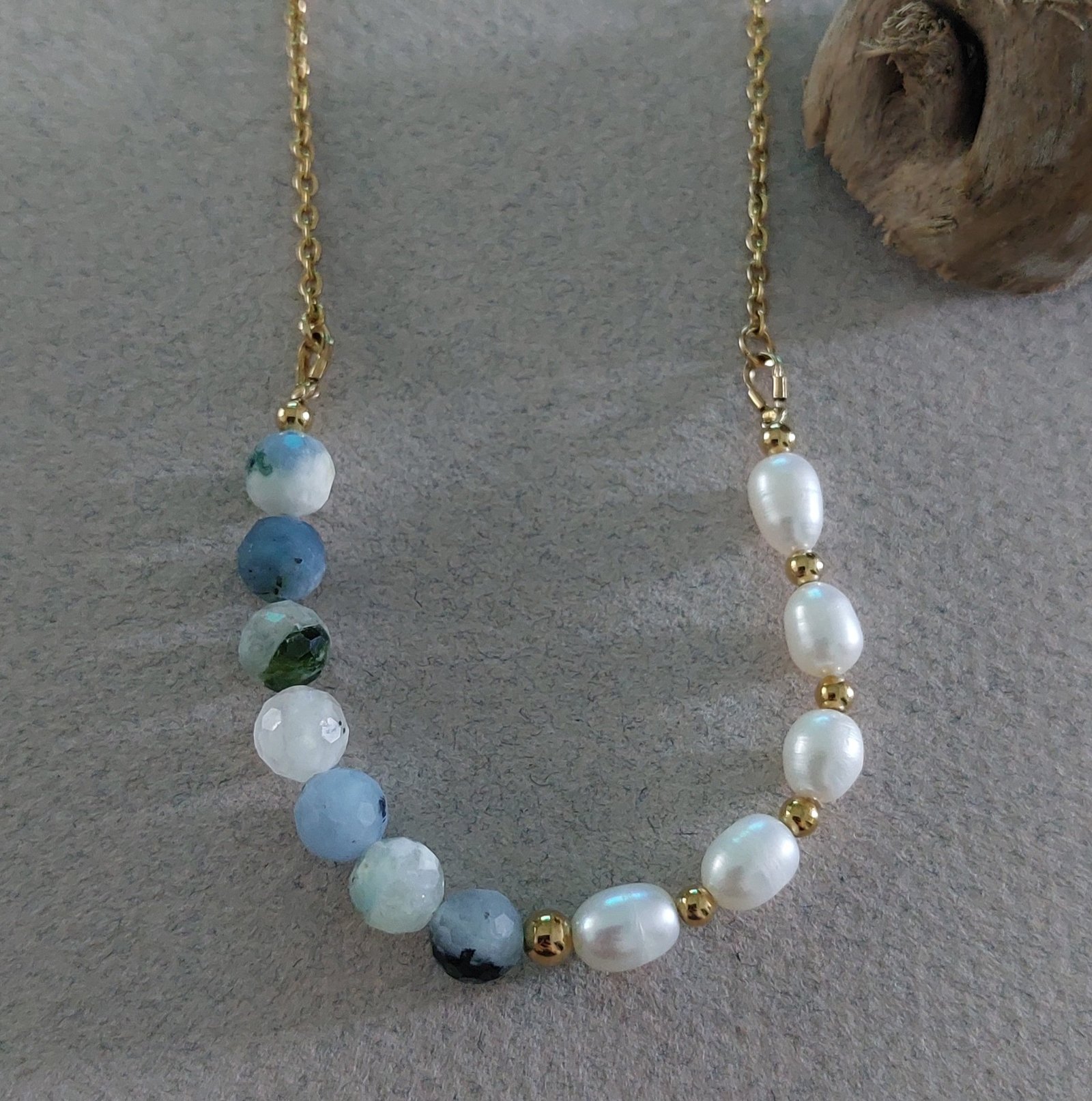 Ce collier associe la douceur nacrée des perles véritables à la profondeur de l’aigue-marine à inclusions de tourmaline, une pierre précieuse aux nuances bleutées ponctuées de reflets sombres et mystérieux. Monté sur une chaîne en acier doré, il apporte une touche lumineuse et raffinée à votre tenue.