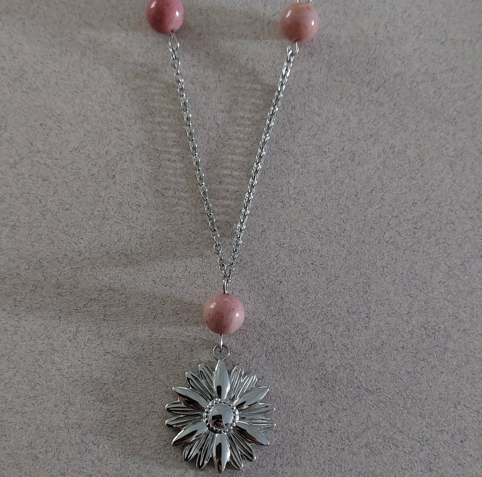 Ce sautoir en acier se compose de belles perles de rhodonite et d’un pendentif en forme de fleur.