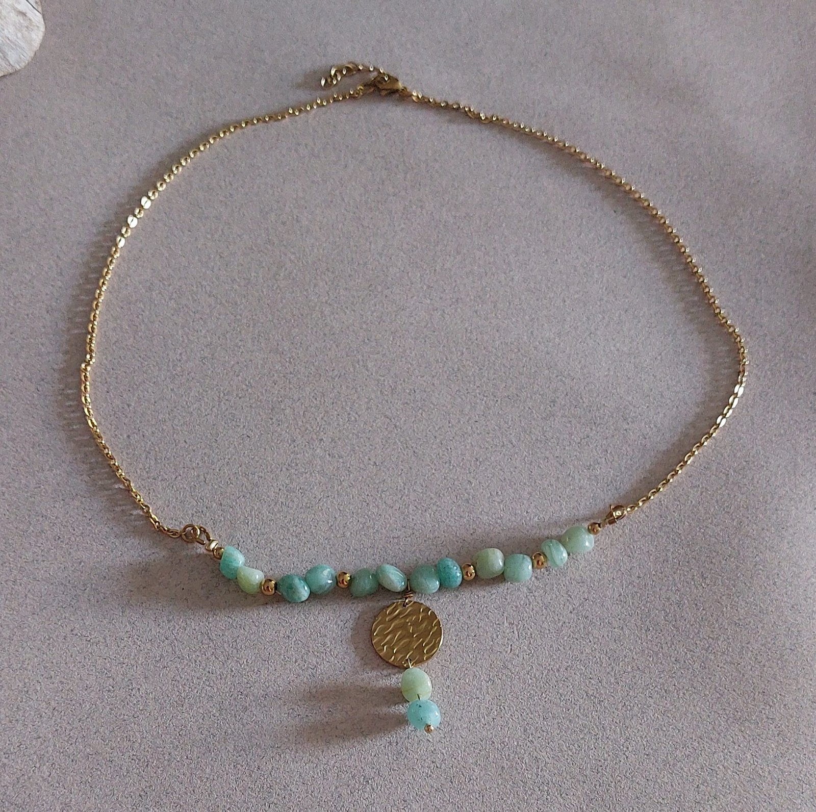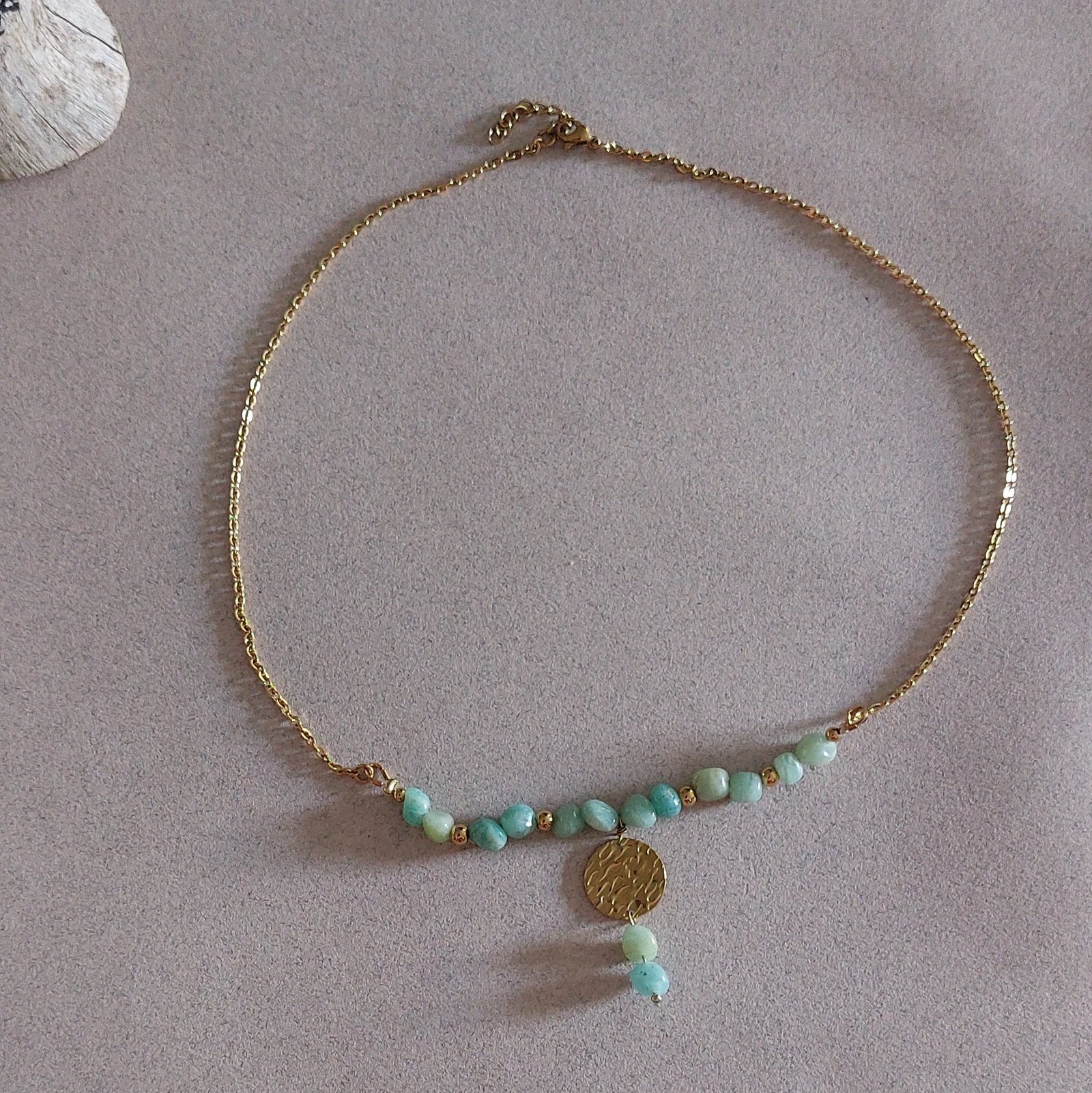 Collier raffiné en acier doré, sublimé par de délicats nuggets d’amazonite.