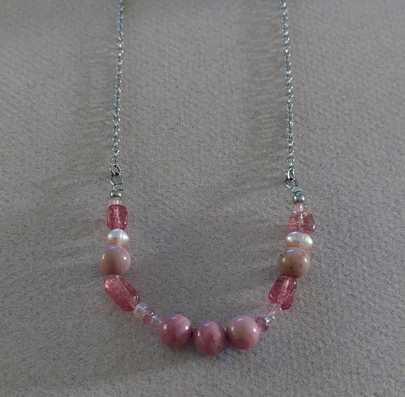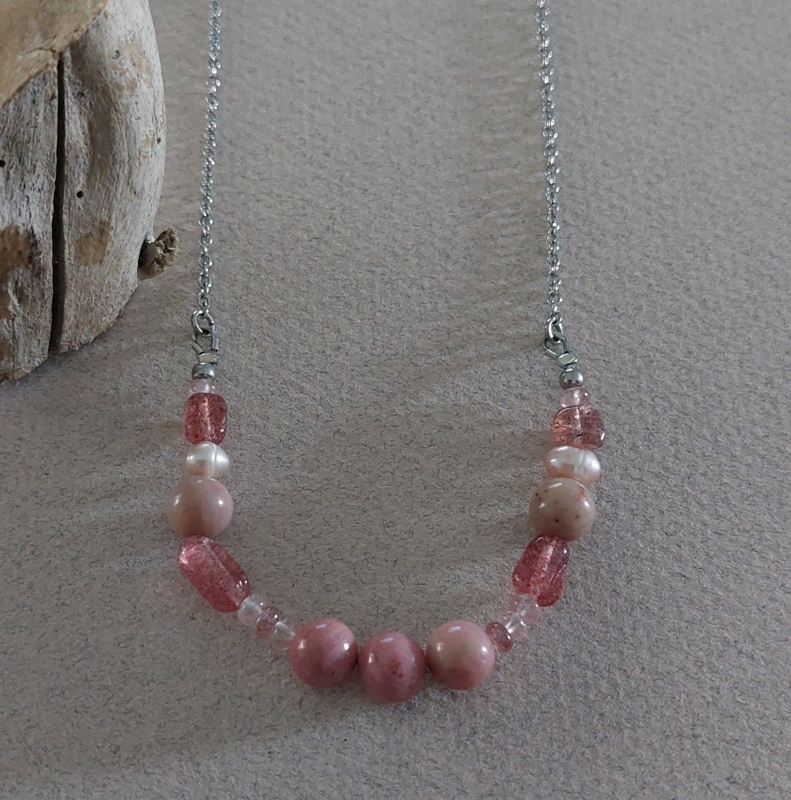 Ce collier dans les tons rosés foncés met en avant le quartz fraise, la rhodonite et les perles naturelles.