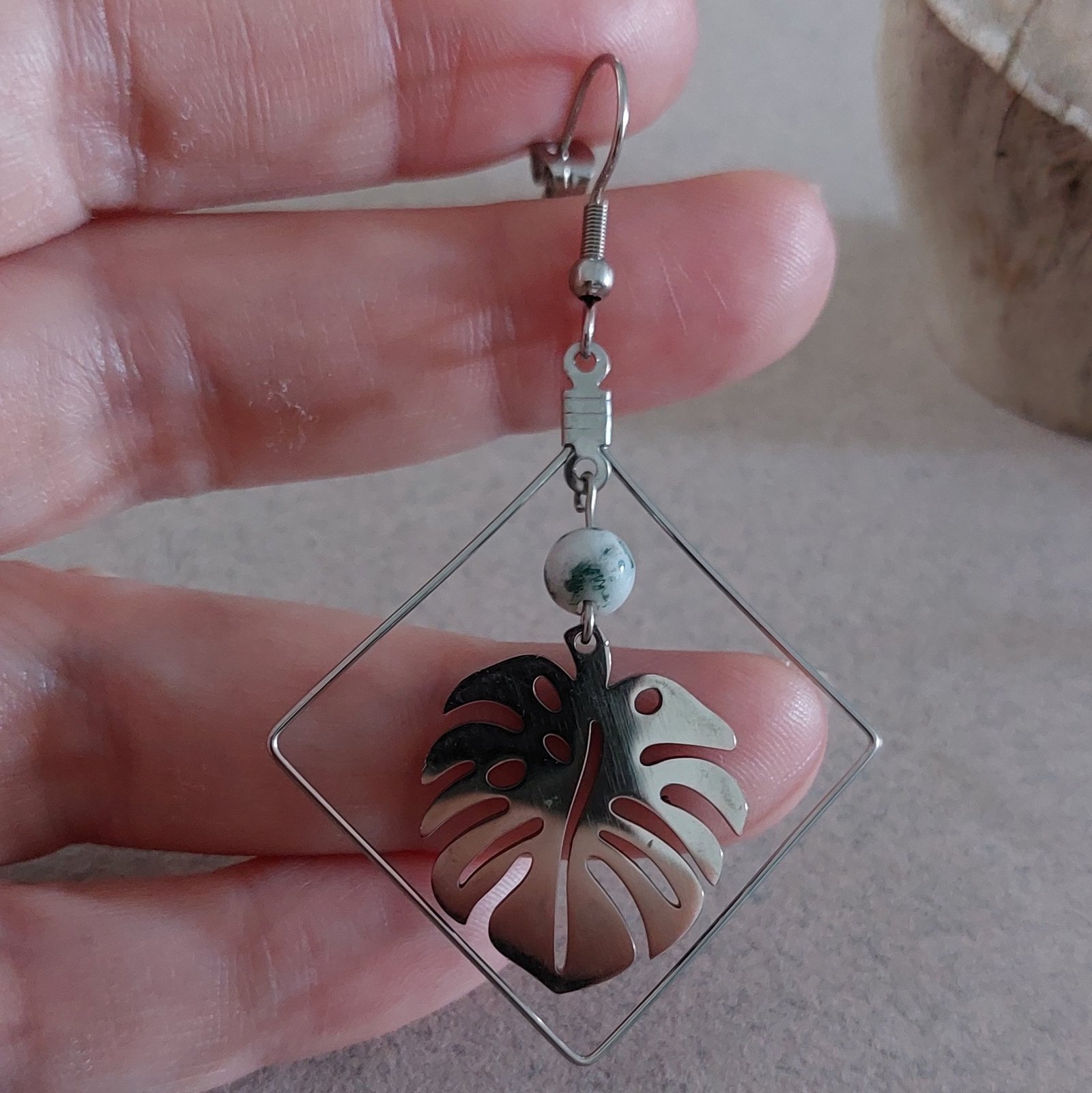Ces jolies boucles d’oreilles géométriques en acier se composent de feuilles de monstera et d’agate arbre.